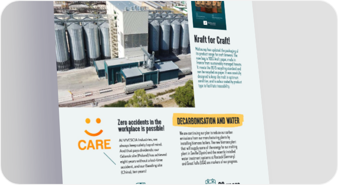 VIVESCIA INDUSTRIES 2022-2023 Kraft for Craft! Malteurop has updated the packaging of its product range for craft brewers. The new bag is 100% kraft paper, made in France from sustainably managed forests. It meets the 95/5 recycling standard and can be recycled as paper. It was carefully designed to keep the malt in optimum condition, and is colour coded by product type to facilitate traceability. Zero accidents in the DECARBONISATION AND WATER workplace is possible! We are continuing our plan to reduce our carbon emissions from our manufacturing plants by At VIVESCIA Industries, we installing biomass boilers. The new biomass plant always keep safety top of mind. that will supply some of the energy for our malting And that pays dividends: our plant in Seville (Spain) and the recently installed Gdansk site (Poland) has achieved water treatment systems at Rostock (Germany) eight years without a lost-time and Great Falls (USA) are markers of our progress. accident, and our Baoding site (China), ten years! AI 30 years Thanks to an artificial intelligence (AI) solution Our Langerringen and Rostock plants being trialled in our malting plants at Vitry-le- celebrated their 30th anniversaries! This François (France), in the USA and in Mexico, it is underlines our long-term commitment to now possible to identify a barley variety using a the local communities where we operate, in smartphone app! Germany and around the world. 13