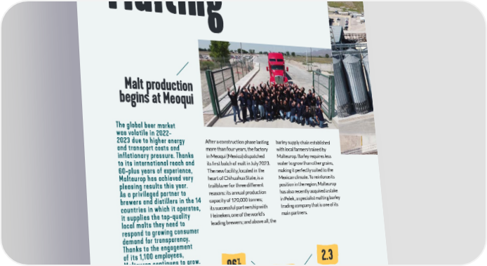 SHAREHOLDERS’ NEWSLETTER VIVESCIA INDUSTRIES 2022-2023 Malting Malt production begins at Meoqui The global beer market was volatile in 2022- 2023 due to higher energy and transport costs and After a construction phase lasting barley supply chain established inflationary pressure. Thanks more than four years, the factory with local farmers trained by to its international reach and in Meoqui (Mexico) dispatched Malteurop. Barley requires less 60-plus years of experience, its 昀椀rst batch of malt in July 2023. water to grow than other grains, Malteurop has achieved very The new facility, located in the making it perfectly suited to the pleasing results this year. heart of Chihuahua State, is a Mexican climate. To reinforce its As a privileged partner to trailblazer for three different position in the region, Malteurop brewers and distillers in the 14 reasons: its annual production has also recently acquired a stake countries in which it operates, capacity of 120,000 tonnes; in Pelek, a specialist malting barley it supplies the top-quality its successful partnership with trading company that is one of its local malts they need to Heineken, one of the world’s main partners. respond to growing consumer leading brewers; and above all, the demand for transparency. Thanks to the engagement of its 1,100 employees, Malteurop continues to grow. % 2.3 It aims to diversify into in 96 new geographical areas and innovative markets of revenue 23 million annual generated tonnes internationally sites production production capacity in 14 countries 12 13