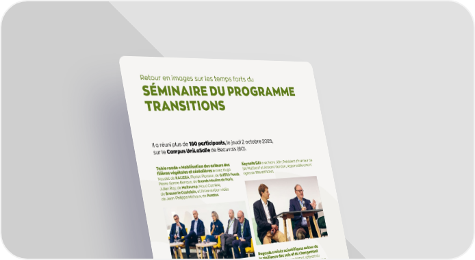 Retour en images sur les temps forts du SÉMINAIRE DU PROGRAMME TRANSITIONS Il a réuni plus de 160 participants, le jeudi 2 octobre 2025, sur le Campus UniLaSalle de Beauvais (60). Keynote SAI avec Hans Jöhr, Président d'honneur de SAI Platform1 et Armand Gandon, responsable amont agricole TRANSITIONS. Regards croisés scientifiques autour de la résilience des sols et du changement climatique avec Étienne Mignot, référent du socle agronomique TRANSITIONS, Bastien Sachet, d'Earthworm Foundation, et Thibaut Déplanche de Celesta-lab. Table ronde « Mobilisation des acteurs des filières végétales et céréalières » avec Hugo Naudet de KALIZEA, Florian Plomion, de Griffith Foods, Pierre Garcia Benque, de Grands Moulins de Paris, Julien Roy, de Malteurop, Maud Carrière, de Brasserie Castelain, et l'intervention vidéo de Jean-Philippe Michaux, de Puratos. Session innovation et agritech, animée par l’équipe TRANSITIONS et avec les regards d'Audrey Bourolleau, fondatrice de la ferme HECTAR, Gustaf Forsberg, CEO de NitroCapt, et Alexandre Viennot, de Kermap. Keynote de David Sergent, secrétaire général de Tereos, un de nos partenaires de la 1re heure. Table ronde « la data, de l'amont à l'aval » animée par Thomas Cornelis, responsable data TRANSITIONS, avec Marie Saglio, de Saipol, Adrien Trompier, de Quantis, Marc Hoppenot, de Wiuz et Alban Collard, agriculteur VIVESCIA. 1. Sustainable Agriculture Initiative Platform. 14