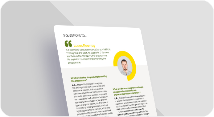 What are the key stages in implementing the programme ? L. R._ Support is provided throughout the entire year on both commercial and agronomic aspects. Training sessions can take very different forms: cover-crop trial visits, classroom sessions to present our traceability tool, collective training on agronomy, humus balance, the different types of organic matter, etc. The value of these group training sessions, which are highly appreciated by farmers, is that they provide food for thought. Then we go back to see them individually the following spring to develop a personalised action plan aimed at improving the four indicators in the agronomic framework. The top priority is to identify how to best leverage agronomic, economic, and climate-related solutions for each farm, bearing in mind that practices vary significantly from one region to another. And then we help them implement these solutions. What concrete actions do you take to support farmers ? L. R._ We are fortunate to have the full backing of VIVESCIA’s agronomy department. Our agronomy experts are trained on TRANSITIONS and help answer all our questions. We have also set up soil rallies: meetings between farmers and agronomists to discuss their challenges. The idea is to build the farmers’ expertise together. For the cohorts that began in September 2023, we developed conferences on specific themes, bringing in external experts. For example, we organised sessions on soil with Celesta Lab and Biodiversity Days with the ecologist Johanna Villenave- Chasset. What are the most common challenges and obstacles farmers face in implementing these action plans ? L. R._ First and foremost, the financial aspect — whether that be related to investment in equipment or purchasing inputs. We prioritise solutions that will have the greatest impact on GHG³ emissions. But choosing solid fertiliser — which requires investment in specific spreading equipment, or maybe one day low- carbon ammonium nitrate instead of nitrogen solutions — does come at a higher cost. Then, climate events can also hinder practices and expected results. We also need to adapt to the specific characteristics of each region, which sometimes prevent us from modifying crop rotation cycles; we must take into account the farm’s history and financial equilibrium. Transitions need to be planned over several years. 3 QUESTIONS TO... Lucas Rouvroy is a technical sales representative at VIVESCIA. Throughout the year, he supports 17 farmers involved in the TRANSITIONS programme. He explains his role in implementing the programme. The interesting thing is being able to share ideas. TRANSITIONS provides a scientific framework, but there are also the technical discussions we have among ourselves; both aspects are crucial to making it happen on the farms and avoiding mistakes as much as possible.” Martin Gosset VIVESCIA Cooperative member in Aisne, Cohort A 3. Greenhouse gases 7