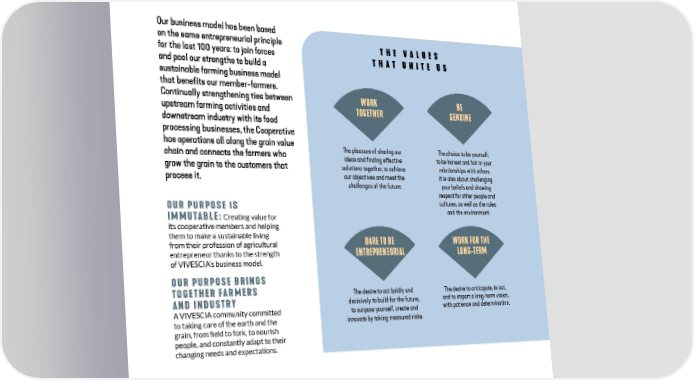 A COOPeRATIVE and eNTrepRenEUrIAL business model Our business model has been based on the same entrepreneurial principle THE VALUES for the last 100 years: to join forces THAT UNITE US and pool our strengths to build a sustainable farming business model that benefits our member-farmers. Continually strengthening ties between WORK BE upstream farming activities and TOGETHER GENUINE downstream industry with its food processing businesses, the Cooperative has operations all along the grain value The pleasure of sharing our The choice to be yourself; chain and connects the farmers who ideas and finding effective to be honest and fair in your grow the grain to the customers that solutions together, to achieve relationships with others. process it. our objectives and meet the It is also about challenging challenges of the future. your beliefs and showing respect for other people and OUR PURPOSE IS cultures, as well as the rules and the environment. Creating value for IMMUTABLE: its cooperative members and helping them to make a sustainable living DARE TO BE WORK FOR THE from their profession of agricultural entrepreneur thanks to the strength ENTREPRENEURIAL LONG-TERM of VIVESCIA’s business model. OUR PURPOSE BRINGS TOGETHER FARMERS The desire to act boldly and The desire to anticipate, to act, AND INDUSTRY decisively to build for the future, and to impart a long-term vision, to surpass yourself, create and with patience and determination. A VIVESCIA community committed to taking care of the earth and the innovate by taking measured risks. grain, from field to fork, to nourish people, and constantly adapt to their changing needs and expectations. VIVESCIA IS PRESENT ALONG THE ENTIRE VALUE CHAIN, ADDING VALUE TO GRAIN, FROM FIELD TO FORK, IN FRANCE AROUND THE WORLD 58