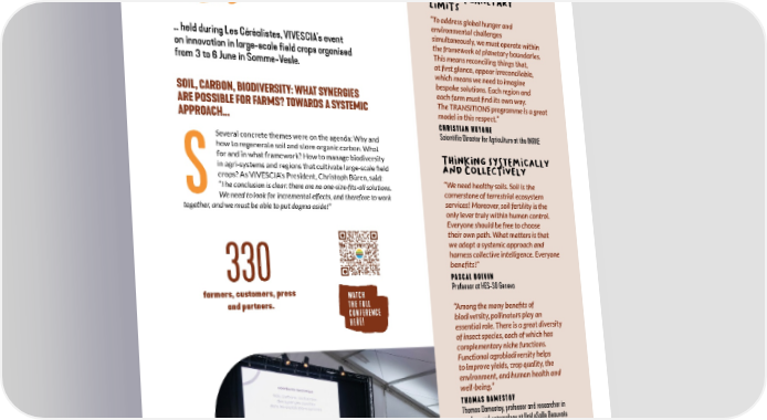 A scientific conference hIGHLIGHTS... IN THE LOOKING aHEaD, BUT WITHIN PLANetArY FIELD LIMITS “To address global hunger and environmental challenges … held during Les Céréalistes, VIVESCIA’s event simultaneously, we must operate within the framework of planetary boundaries. on innovation in large-scale field crops organised This means reconciling things that, from 3 to 6 June in Somme-Vesle. at first glance, appear irreconcilable, which means we need to imagine bespoke solutions. Each region and SOIL, CARBON, BIODIVERSITY: WHAT SYNERGIES each farm must find its own way. ARE POSSIBLE FOR FARMS? TOWARDS A SYSTEMIC The TRANSITIONS programme is a great APPROACH… model in this respect.” CHRISTIAN HUYGHE Several concrete themes were on the agenda: Why and Scientific Director for Agriculture at the INRAE how to regenerate soil and store organic carbon. What for and in what framework? How to manage biodiversity THINKING SYSTeMICaLLY in agri-systems and regions that cultivate large-scale field aNd COLLecTIVELY crops? As VIVESCIA’s President, Christoph Büren, said: “We need healthy soils. Soil is the S“The conclusion is clear: there are no one-size-fits-all solutions. cornerstone of terrestrial ecosystem We need to look for incremental effects, and therefore to work services! Moreover, soil fertility is the together, and we must be able to put dogma aside!” only lever truly within human control. Everyone should be free to choose their own path. What matters is that we adopt a systemic approach and harness collective intelligence. Everyone benefits!” 330 PASCAL BOIVIN farmers, customers, press WATCH Professor at HES-SO Geneva and partners. THE FULL CONFERENCE “Among the many benefits of HERE! biodiversity, pollinators play an essential role. There is a great diversity of insect species, each of which has complementary niche functions. Functional agrobiodiversity helps to improve yields, crop quality, the environment, and human health and well-being.” THOMAS DAMESTOY Thomas Damestoy, professor and researcher in ecology and entomology at UniLaSalle Beauvais “There are clear synergies to be found between protecting biodiversity and maintaining yields. But you can’t improve what you can’t measure.” MICHEL-PIERRE FAUCON Michel-Pierre Faucon, professor and researcher in plant ecology and agro-ecology and Director of Research at UniLaSalle Beauvais. 22