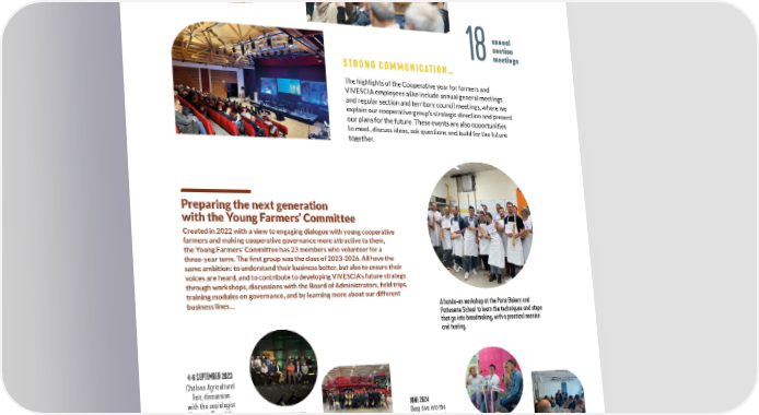 Governance 2,100+ participants in 2023 annual 18 section meetings STRONG COMMUNICATION… The highlights of the Cooperative year for farmers and VIVESCIA employees alike include annual general meetings and regular section and territory council meetings, where we explain our cooperative group’s strategic direction and present our plans for the future. These events are also opportunities to meet, discuss ideas, ask questions and build for the future together. Preparing the next generation with the Young Farmers’ Committee Created in 2022 with a view to engaging dialogue with young cooperative farmers and making cooperative governance more attractive to them, the Young Farmers’ Committee has 23 members who volunteer for a three-year term. The first group was the class of 2023-2026. All have the same ambition: to understand their business better, but also to ensure their voices are heard, and to contribute to developing VIVESCIA’s future strategy through workshops, discussions with the Board of Administrators, field trips, training modules on governance, and by learning more about our different business lines… A hands-on workshop at the Paris Bakery and Patisserie School to learn the techniques and steps that go into breadmaking, with a practical session and tasting. 4-6 SEPTEMBER 2023 Châlons Agricultural Fair, discussion with the sociologist JUNE 2024 François Purseigle. 10 DECEMBER 2023 Deep dive into the A roundtable at the wheat/flour/bread SEPT. VIVESCIA Day. JAN. value chain in Reims SEPT. and Paris. 2023 2024 JANUARY 2024 5 SEPTEMBER 2024 18 SEPTEMBER 2024 DEC. Field trip to JUNE Châlons Agricultural Meeting with the the Netherlands to Fair, meeting with board and the Exco, discover the challenges Group employees. discussion on our currently faced by CSR policy, LINK. Dutch agriculture. CONSOLIDATED REPORT 2023-2024 11
