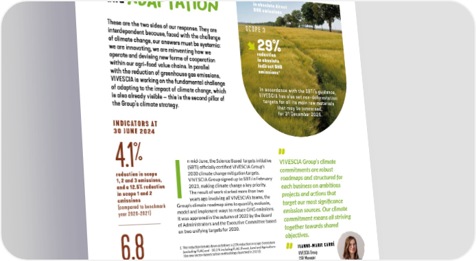 SBTI-certified targets for 2030 CLImatE - Benchmark year 2021 CHANGE: SCOPE 1 AND 2 42% MITIGATIoN reduction in absolute direct and GHG emissions aDAPTATIoN These are the two sides of our response. They are SCOPE 3 interdependent because, faced with the challenge 29% of climate change, our answers must be systemic: we are innovating, we are reinventing how we reduction operate and devising new forms of cooperation in absolute indirect GHG within our agri-food value chains. In parallel emissions1 with the reduction of greenhouse gas emissions, VIVESCIA is working on the fundamental challenge In accordance with the SBTi’s guidance, of adapting to the impact of climate change, which VIVESCIA has also set non-deforestation is also already visible – this is the second pillar of targets for all its main raw materials the Group’s climate strategy. that may be concerned, for 31 December 2025. INDICATORS AT 30 JUNE 2024 % 4.1 n mid-June, the Science Based Targets initiative VIVESCIA Group’s climate (SBTi) officially certified VIVESCIA Group’s commitments are robust reduction in scope 2030 climate change mitigation targets. 1, 2 and 3 emissions, VIVESCIA Group signed up to SBTi in February roadmaps and structured for and a 12.5% reduction 2023, making climate change a key priority. each business on ambitious in scope 1 and 2 I The result of work started more than two projects and actions that emissions years ago involving all VIVESCIA’s teams, the (compared to benchmark Group’s climate roadmap aims to quantify, evaluate, year 2020-2021) target our most significance model and implement ways to reduce GHG emissions. emission sources. Our climate It was approved in the autumn of 2022 by the Board commitment means all striving of Administrators and the Executive Committee based on two unifying targets for 2030. together towards shared objectives. 1. The reduction breaks down as follows: a 25% reduction in scope 3 emissions 6.8 (excluding FLAG and - 30.3 % including FLAG (Forest, Land and Agriculture: JEANNE-MARIE CARRÉ The new sector-based carbon methodology launched in 2023)). VIVESCIA Group MtCO e CSR Manager 2 in scope 1, 2 and 3 GHG emissions vs 7.1 MtCO₂e (benchmark year 2020-2021) 32