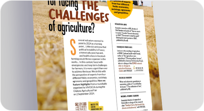 2024, We try to answer a good year this question with the perspective of experts from four different fields: economics, for facing sociology, agronomy THE and geopolitics. CHALLENGeS SÉBASTIEN ABIS Associate researcher at IRIS, director of Club Déméter and author of “Veut-on nourrir of agriculture? le monde ? Franchir l’Everest alimentaire en 2050” (“Do we want to feed the world? Climbing the food mountain in 2050”, everal indicators seemed to published by Dunod). point to 2024 as a turning point… Little did we know that FRANÇOIS PURSEIGLE political instability in France, Lecturer in the sociology of agriculture Sa historically poor harvest, at ENSAT, Toulouse (south-west France), and health crises in livestock author of “Une agriculture sans farming would throw a spanner in the agriculteurs” (“Farming without farmers”, works… In this context, faced with published by Sciences Po University Press), who is in charge of the GERMEA research emergencies and long-term challenges chair on changes to for farmers, it is more urgent than ever agricultural business to address the issue. We do this with models with VIVESCIA*. the perspective of experts from four different fields: economics, sociology, NICOLAS BOUZOU agronomy and geopolitics. Here we Writer and columnist specialising in feature highlights from a roundtable economics, author of “La civilisation organised by VIVESCIA during the de la peur” (“The civilisation of fear”, Châlons Agricultural Fair published by XO). on 2 September 2024. MICHEL-PIERRE FAUCON Associate director of research at WATCH THE UniLaSalle in charge of the research ENTIRE chair “Resilient farms that benefit the ROUNDTABLE BY climate and biodiversity” with VIVESCIA. SCANNING THE QR CODE *In partnership with cooperative groups EURALIS and TERRENA. 18