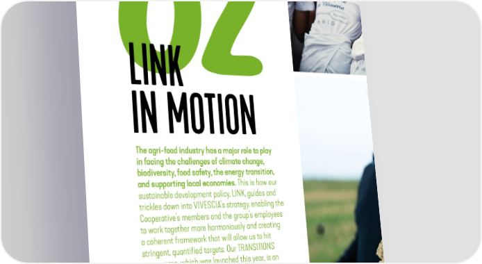 PART 02 LINK IN MOTION The agri-food industry has a major role to play in facing the challenges of climate change, biodiversity, food safety, the energy transition, and supporting local economies. This is how our sustainable development policy, LINK, guides and trickles down into VIVESCIA’s strategy, enabling the Cooperative’s members and the group’s employees to work together more harmoniously and creating a coherent framework that will allow us to hit stringent, quantified targets. Our TRANSITIONS programme, which was launched this year, is an illustration of that. But it’s not the only one. 26