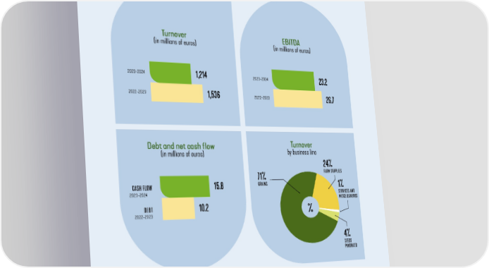Going further Turnover EBITDA (in millions of euros) (in millions of euros) 2023-2024 1,214 2023-2024 23.2 2022-2023 1,536 2022-2023 26.7 Debt and net cash flow Turnover (in millions of euros) by business line 24% 71% FARM SUPPLIES CASH FLOW 15.8 GRAINS 1% 2023-2024 SERVICES AND MISCELLANEOUS DEBT 10.2 %% 2022-2023 4% SEEDS PRODUCED CONSOLIDATED REPORT 2023-2024 55