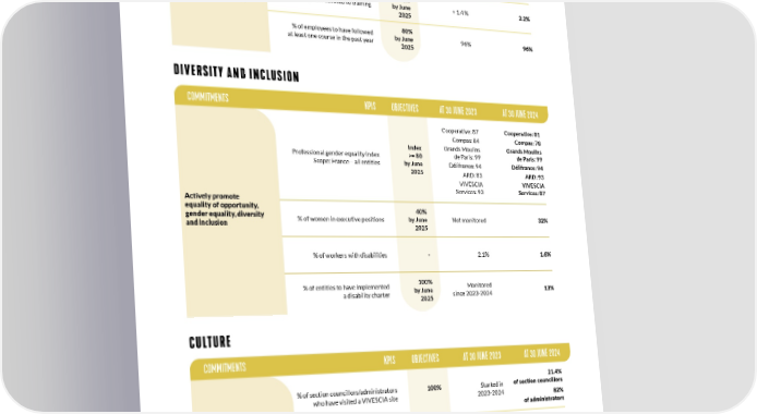 TALENT COMMITMENTS KPIS OBJECTIVES AT 30 JUNE 2023 AT 30 JUNE 2024 Campaign underway % of employees who have an annual 100% 50% appraisal and customised by June Following change development plan (excl. Délifrance) 2025 of process Boost the Group’s employer 3% brand and increase % of the wage bill devoted to training by June + 1.4 % 2.2% colleague employability 2025 % of employees to have followed 80% at least one course in the past year by June 96% 96% 2025 DIVERSITY AND INCLUSION COMMITMENTS KPIS OBJECTIVES AT 30 JUNE 2023 AT 30 JUNE 2024 Cooperative: 87 Cooperative: 81 Compas: 84 Compas: 78 Index Grands Moulins Grands Moulins Professional gender equality index >= 80 de Paris: 99 de Paris: 99 Scope: France – all entities by June Délifrance: 94 Délifrance: 94 2025 ARD: 83 ARD: 93 VIVESCIA VIVESCIA Services: 93 Services: 87 Actively promote equality of opportunity, 40% gender equality, diversity % of women in executive positions by June Not monitored 32% and inclusion 2025 % of workers with disabilities - 2.1% 1.6% % of entities to have implemented 100% Monitored a disability charter by June 13% since 2023-2024 2025 CULTURE COMMITMENTS KPIS OBJECTIVES AT 30 JUNE 2023 AT 30 JUNE 2024 21.4% % of section councillors/administrators 100% Started in of section councillors who have visited a VIVESCIA site 2023-2024 82% of administrators Develop Group culture and cultivate our % of employees who have followed 100% Not provided 42% cooperative farming Welcome VIVESCIA in 2025 DNA % of executives who have followed Grain Route an onboarding programme including 100% onboarding information about challenges faced - in 2025 programme restarted by the Cooperative and agriculture in October 2024 64