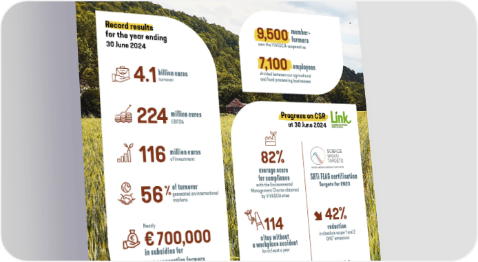 A MODEL cREated bY faRmERS foR faRmERS Record results 9,500 member- farmers for the year ending own the VIVESCIA cooperative 30 June 2024 7,100 employees billion euros divided between our agricultural and food processing businesses turnover 4.1 million euros Progress on CSR 224 EBITDA at 30 June 2024 million euros 116of investment 82 % average score SBTi FLAG certification for compliance of turnover with the Environmental Targets for 2023 %generated on international Management Charter obtained 56 markets by VIVESCIA sites Nearly 114 42% reduction € 700,000 sites without in absolute scope 1 and 2 in subsidies for a workplace accident GHG* emissions for at least a year new cooperative farmers and young farmers 29% 100,000 reduction in absolute scope 3 packs of Francine GHG* emissions flour distributed 1/4 of French food banks’ annual *Greenhouse gases requirements 06
