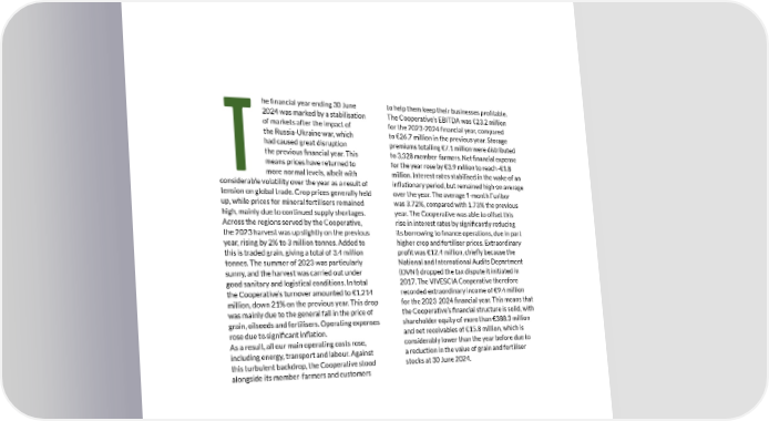 THE COOPERATIVE'S acCOUNTS AT 30 JUNE 2024 to help them keep their businesses profitable. he financial year ending 30 June The Cooperative’s EBITDA was €23.2 million 2024 was marked by a stabilisation of markets after the impact of for the 2023-2024 financial year, compared to €26.7 million in the previous year. Storage the Russia-Ukraine war, which had caused great disruption premiums totalling €7.1 million were distributed to 3,328 member-farmers. Net financial expense the previous financial year. This Tmeans prices have returned to for the year rose by €3.9 million to reach -€1.8 more normal levels, albeit with million. Interest rates stabilised in the wake of an considerable volatility over the year as a result of inflationary period, but remained high on average over the year. The average 1-month Euribor tension on global trade. Crop prices generally held up, while prices for mineral fertilisers remained was 3.72%, compared with 1.73% the previous high, mainly due to continued supply shortages. year. The Cooperative was able to offset this rise in interest rates by significantly reducing Across the regions served by the Cooperative, its borrowing to finance operations, due in part the 2023 harvest was up slightly on the previous higher crop and fertiliser prices. Extraordinary year, rising by 2% to 3 million tonnes. Added to profit was €12.4 million, chiefly because the this is traded grain, giving a total of 3.4 million National and International Audits Department tonnes. The summer of 2023 was particularly sunny, and the harvest was carried out under (DVNI) dropped the tax dispute it initiated in good sanitary and logistical conditions. In total 2017. The VIVESCIA Cooperative therefore recorded extraordinary income of €9.4 million the Cooperative’s turnover amounted to €1,214 for the 2023-2024 financial year. This means that million, down 21% on the previous year. This drop was mainly due to the general fall in the price of the Cooperative’s financial structure is solid, with grain, oilseeds and fertilisers. Operating expenses shareholder equity of more than €388.3 million rose due to significant inflation. and net receivables of €15.8 million, which is considerably lower than the year before due to As a result, all our main operating costs rose, a reduction in the value of grain and fertiliser including energy, transport and labour. Against stocks at 30 June 2024. this turbulent backdrop, the Cooperative stood alongside its member-farmers and customers 54