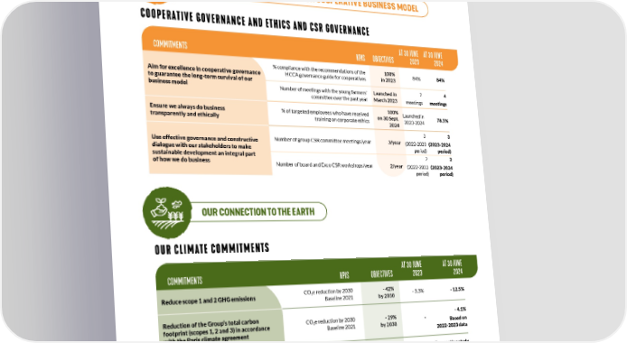Going further SUMMARY of oUR COMmItMentS, oUR obJeCtIVeS aNd oUR MAIN INdICATORS CONNECTIONS ARE CENTRAL TO OUR COOPERATIVE BUSINESS MODEL COOPERATIVE GOVERNANCE AND ETHICS AND CSR GOVERNANCE AT 30 JUNE AT 30 JUNE COMMITMENTS KPIS OBJECTIVES 2023 2024 % compliance with the recommendations of the 100% 84% 84% Aim for excellence in cooperative governance HCCA governance guide for cooperatives in 2023 to guarantee the long-term survival of our business model Number of meetings with the young farmers’ Launched in 2 4 committee over the past year March 2023 meetings meetings 100% Ensure we always do business % of targeted employees who have received on 30 Sept. Launched in 78.5% training on corporate ethics transparently and ethically 2023-2024 2024 3 3 Number of group CSR committee meetings/year 3/year Use effective governance and constructive (2022-2023 (2023-2024 dialogue with our stakeholders to make period) period) sustainable development an integral part 2 2 of how we do business Number of board and Exco CSR workshops/year 2/year (2022-2023 (2023-2024 period) period) OUR CONNECTION TO THE EARTH OUR CLIMATE COMMITMENTS AT 30 JUNE AT 30 JUNE COMMITMENTS KPIS OBJECTIVES 2023 2024 COe reduction by 2030 - 42% Reduce scope 1 and 2 GHG emissions 2 - 3.3% - 12.5% Baseline 2021 by 2030 Reduction of the Group’s total carbon - 4.1% COe reduction by 2030 - 29% 2 * footprint (scopes 1, 2 and 3) in accordance Baseline 2021 by 2030 Based on with the Paris climate agreement 2022-2023 data Forecasting study carried out on the Cooperative Evaluate the impact of climate change territory on crops in the Cooperative territory 20 different and our sourcing regions in France pedoclimatic regions and around the world, and develop Adaptation plan adaptation plans currently being defined *New indicator for 2023-2024. CONSOLIDATED REPORT 2023-2024 61