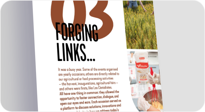 PART 03 FORGING LINKS... It was a busy year. Some of the events organised are yearly occasions, others are directly related to our agricultural or food processing activities – the harvest, inaugurations, agricultural fairs – and others were firsts, like Les Céréalistes. All have one thing in common: they allowed the opportunity to foster connection, dialogue, and open our eyes and ears. Each occasion served as a platform to discuss solutions, innovations and to create solidarity in how we address today’s and tomorrow’s challenges! 42