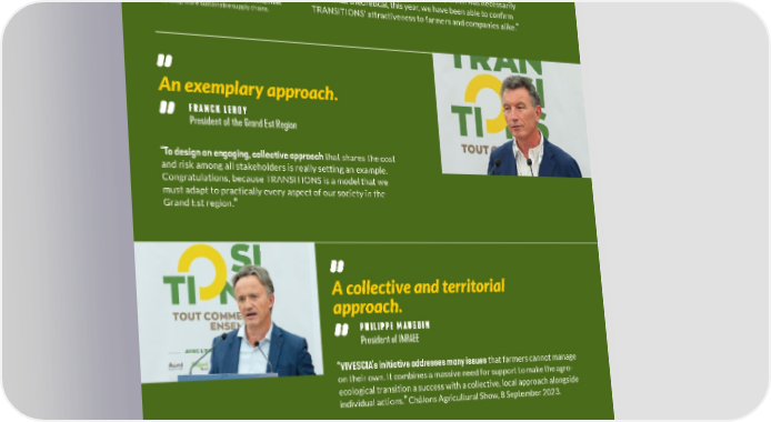 TESTIMONIALS... Our working hypotheses were confirmed! BASTIEN SACHET 1 Director of the Earthworm Foundation, founding partner of the coalition “TRANSITIONS really makes France pioneers! After nearly two years of work together, which was necessarily 1. Earthworm Foundation is an international somewhat theoretical, this year, we have been able to confirm non-profit organisation that helps companies TRANSITIONS’ attractiveness to farmers and companies alike. develop more sustainable supply chains. ” An exemplary approach. FRANCK LEROY President of the Grand Est Region “To design an engaging, collective approach that shares the cost and risk among all stakeholders is really setting an example. Congratulations, because TRANSITIONS is a model that we must adapt to practically every aspect of our society in the Grand Est region.” A collective and territorial approach. PHILIPPE MAUGUIN President of INRAEE “VIVESCIA’s initiative addresses many issues that farmers cannot manage on their own. It combines a massive need for support to make the agro- ecological transition a success with a collective, local approach alongside individual actions. ” Châlons Agricultural Show, 8 September 2023. Virtuous value transfer. BRUNO BONNEL Secretary General for Investment, in charge of the France 2030 plan “Agricultural cooperatives are very important intermediaries on the ground. We wholeheartedly support the TRANSITIONS programme. The idea is really to get upstream and downstream stakeholders Christoph Büren, President of VIVESCIA Group, working together to promote the virtuous transfer of value. and Bruno Bonnell at the Paris International The state will continue to support this coalition as it develops. ” Agriculture Show, Monday, 26 February 2024.