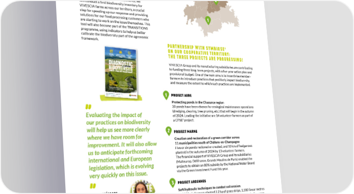 LINK in motion 3 2 After analysing all the self-assessments, we will conduct a first biodiversity inventory for VIVESCIA farms across our territory, a crucial step for speeding up our response and providing 1 solutions for our food processing customers who are starting to work on the issue themselves. This tool will also become part of the TRANSITIONS programme, using indicators to help us better calibrate the biodiversity part of the agronomic framework. 1 PARTNERSHIP WITH SYMBIOSE VIVE SCIA _AGRI BEST _AFFI CHE_I MPRI MEUR. pdf 1 19/0 7/202 4 08:47 ON OUR COOPERATIVE TERRITORY: À P AR TIR DU A CCESSIBLE À T OUS LES SIMPLE, GR A 3 SEP TUIT TEMBRE A THE THREE PROJECTS ARE PROGRESSING! SSOCIÉS-COOPÉR A TEUR S ET R 202 APIDE 4 VIVESCIA 40MIN DIA VIVESCIA Group and its manufacturing subsidiaries are contributing GNOS TIC BIODIVER to funding three long-term projects, with a five-year action plan and LANCEZ-V SITE OUS DES MAINTENANT provisional budget. One of the main aims is to incentivise member- farmers to introduce practices that positively impact biodiversity, A •comprendre et évaluer les effets de vos p VEC L ’OUTIL r agricoles sur la biodiversité atiques and measure the extent to which such practices are implemented. •id A * entifier et visualiser les voies de progrès p GRIBES des p our r T , atiques agricoles en faveur de la b p iodiversité • ermettre à votre Coop ér ative de vous p V un accomp roposer OUS POURREZ agnement technique sur mesure et des formations adap tées DÉMARREZ DÈS MAINTENANT EN V OUS CONNEC T et d ANT SUR écouvrez notre esp avec d ace dédié sur tous les enjeux Biod es vidéos, un tutoriel, un guide b iversité iod iversité sur Arterre. Ce diagnostic biodiversité est proposé gr VIVESCIA. P atuitement à tous les associés-coopér our toute information, contactez votre agronome spécialisée sur l'eau et la biodiversité à biodiversite@v ateurs ivescia.com PROJECT AUBE *AgriBEST est un outil codéveloppé par La Coopération Agricole et CDC BIODIVERSITE 1 Protecting ponds in the Chaource region 30 ponds have been chosen for ecological maintenance operations Evaluating the impact of (dredging, clearing, tree pruning, etc.) that will begin in the autumn of 2024. Leading the initiative are 14 volunteer farmers as part of 2 our practices on biodiversity a CPSE project. will help us see more clearly 2 PROJECT MARNE where we have room for Creation and restoration of a green corridor across improvement. It will also allow 11 municipalities south of Châlons-en-Champagne us to anticipate forthcoming Five or six ponds restored or created, and 10 km of hedgerows planted in the autumn of 2024 by 13 volunteer farmers. international and European The financial support of VIVESCIA Group and its subsidiaries legislation, which is evolving (Malteurop, Délifrance, Grands Moulins de Paris) enabled the projects to obtain an 80% subsidy by the National Water Board very quickly on this issue. via the Green Investment Fund this year. 3 PROJECT ARDENNES MARIE THÉODORE Soft hydraulic techniques to combat soil erosion. VIVESCIA water and In 2023, six farmers planted 2.2 ha of grass strips, 1,180 linear metres biodiversity expert of hedgerows, and 265 linear metres of fascines as part of a five-year 2 CPSE agreement. 1. “Symbiose, pour des paysages de biodiversité” (“Symbiosis, for biodiverse landscapes”) is a 2. Environmental services contracts. non-profit umbrella group for managing biodiversity in the Champagne-Ardenne region, bringing together researchers, farmers, hunters, beekeepers, naturalists, technicians, funders and other interested parties. An environmental protection association that is officially recognised as being in the public interest, it comprises 28 member organisations in various categories (community associations, local authorities, professional farming groups). CONSOLIDATED REPORT 2023-2024 37