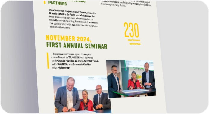 SEPTEMBER 2024, TRANSITIONS TURNS ITS VISION INTO ACTION AN AMBITION REALISED CONTINUED SUPPORT FROM Châlons Trade Fair: feedback and testimonials on the technical support OUR MANUFACTURING with cooperative farmers Jean-Philippe Mignot and Stéphane Borderieux; and sales engineer Rémy Chobriat. PARTNERS Etea Sedamyl, Roquette and Tereos, alongside Grands Moulins de Paris and Malteurop, the food processing partners who supported us from the very beginning, have decided to extend the partnership with a commitment to purchase additional volumes. 230 NOVEMBER 2024, new farmers FIRST ANNUAL SEMINAR committed Three new customers sign a three-year commitment to TRANSITIONS: Puratos with Grands Moulins de Paris, Griffith Foods with KALIZEA, and Brasserie Caulier with Malteurop. 160 participants on the campus of UniLaSalle Beauvais.