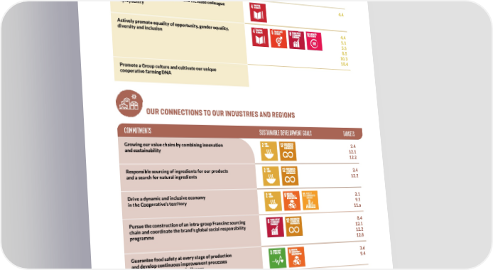 Going further OUR CONNECTIONS TO PEOPLE COMMITMENTS SUSTAINABLE DEVELOPMENT GOALS TARGETS Provide a safe workplace where well-being is paramount 3.6 by preventing psychosocial hazards and creating a stronger 8.8 safety culture Boost the Group’s employer brand and increase colleague 4.4 employability Actively promote equality of opportunity, gender equality, 4.4 diversity and inclusion 5.1 5.5 8.5 10.3 10.4 Promote a Group culture and cultivate our unique cooperative farming DNA OUR CONNECTIONS TO OUR INDUSTRIES AND REGIONS COMMITMENTS SUSTAINABLE DEVELOPMENT GOALS TARGETS Growing our value chains by combining innovation 2.4 and sustainability 12.1 12.2 Responsible sourcing of ingredients for our products 2.4 and a search for natural ingredients 12.2 Drive a dynamic and inclusive economy 2.1 in the Cooperative’s territory 9.5 11.a Pursue the construction of an intra-group Francine sourcing 8.4 chain and coordinate the brand’s global social responsibility 12.1 programme 12.2 12.8 Guarantee food safety at every stage of production 3.d and develop continuous improvement processes 9.4 while anticipating future challenges Strengthen the positive impact of our French and international 4.3 production facilities on local communities 4.4 4.5 11.a 12.3 Sharing our knowledge and know-how, contributing to 4.3 the development of entrepreneurship and the sustainability 4.4 of agricultural professions 4.5 4.7 17.16 CONSOLIDATED REPORT 2023-2024 69