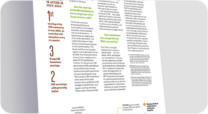 LINK in motion daily support to all other In short, we are making for (scope 3), in particular those functions engaged in addressing from upstream agricultural progress! These achievements these challenges. Communities are the result of the activities. Another development commitment and efforts of are growing around the Group’s concerns water — a critical major cross-functional projects, issue both in agriculture and everyone across all the Group’s entities, and I extend my sincere such as climate ambassadors manufacturing — which is now driving the decarbonisation part of our strategy. Work on thanks to them! This collective strategy, ambassadors for the engagement is undoubtedly my ve this aspect will begin in 2025. In implementation of the Group’s greatest satisfaction, as it is the the spring of 2024, VIVESCIA CSR essential condition for making Environmental Charter, and Group also started evaluating éduction GOVERNANCE progress in this area. coordinators for all non- its nature footprint using the financial reporting efforts. IN ACTION IN ésilience SBTN3 methodology. We More generally, our teams 2023-2024 Does this mean that will use this work to define sustainable development is — and not just those directly objectives that promote now an integral part of the involved in CSR — have made biodiversity, regenerate the soil, significant strides in how they and protect nature. We plan to st Group’s business model? approach and think about their start analysing the results in work. CSR is advancing both 1 early 2025. We want to work in actions and in mindsets, and on environmental issues more The Group continues meeting of the to increase its focus on that is the key to success! systemically and that requires a sustainability to encompass (See testimonials on pages 40/41). cultural change, which is why we CSR community in June 2024, an economic, environmental, are launching the LINK School. event that will and social dimensions — it Some commitments We are also seeking to move has become an integral part have changed this year. forward on the issues of gender take place every equality and disability. There is of our daily operations. The Which ones and why? six months leadership teams are both no shortage of projects! Next drivers and active participants year promises to be a very busy time. Progress is continuing, and in this transformation. The Over time, as we gain it’s a continuous effort! Board and the Exco organise experience, it is natural — regular events devoted entirely and desirable — for us to 1. C reated following the Paris Agreement, and to LINK. Non-financial criteria 3 adapt, refine, and deepen a product of a collaboration between several institutions around the world, including the are part of our medium-term Group CSR our commitments. This year, UN, the Science-Based Targets Initiative plans (MTP) and business we have aligned our climate (SBTi) is now the benchmark in terms of Committee companies’ carbon trajectories. reviews. On the ground, CSR commitments with the Group’s governance is fully operational meetings 2030 trajectories, following the 2. SBTi FLAG (Forest, Land, and Agriculture): Since March 2023, this new sector-specific across the Group’s various SBTi framework I mentioned carbon methodology has been helping to set business lines and is part of the earlier. Recognised for its targets aligned with the Paris Agreement for reducing CO2 emissions related to agriculture, Group’s overall governance. robust methodology, the forestry, and land use. This includes CSR Committees SBTi framework sets targets 3. S BTN (Science-Based Targets for Nature): The 2 within each of the major for reducing greenhouse gas Science-Based Targets for Nature initiative is a global effort to establish clear, measurable business lines, dedicated CSR emissions that we are directly CSR workshops managers and directors, and responsible for. It also drives scientific targets for conserving and restoring nature, similar to the Science-Based Targets with governing regular working meetings. initiatives to reduce emissions (SBTs) established for climate action. bodies These expert teams provide we are indirectly responsible Launch of VIVESCIA TRANSITIONS goes from strength Workshop with Board Group’s nature footprint to strength: 420 farmers signed up of Administrators assessment for the programme and Executive Committee. FEB. APRIL SEPT. Launch of a biodiversity Group CSR assessment for all VIVESCIA committee Cooperative members 2024 Launch of the VIVESCIA/ Certification Launch of Francine’s CSR policy UniLaSalle research chair MAI JUNE of our 2030 climate targets The Group signs a new three-year by SBTi partnership with Banques Alimentaires CONSOLIDATED REPORT 2023-2024 29