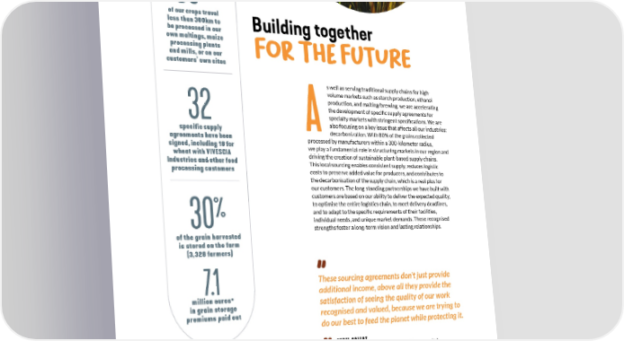 Finding new solutions DId YOU KNOW? 80% of our crops travel less than 300km to Building together be processed in our own maltings, maize processing plants FOR THE FUTURE and mills, or on our customers’ own sites s well as serving traditional supply chains for high- volume markets such as starch production, ethanol production, and malting/brewing, we are accelerating the development of specific supply agreements for 32 specialty markets with stringent specifications. We are also focusing on a key issue that affects all our industries: specific supply A agreements have been decarbonization. With 80% of the grains collected signed, including 18 for processed by manufacturers within a 300-kilometer radius, wheat with VIVESCIA we play a fundamental role in structuring markets in our region and Industries and other food driving the creation of sustainable plant-based supply chains. processing customers This local sourcing enables consistent supply, reduces logistic costs to preserve added value for producers, and contributes to the decarbonisation of the supply chain, which is a real plus for our customers. The long-standing partnerships we have built with customers are based on our ability to deliver the expected quality, to optimise the entire logistics chain, to meet delivery deadlines, % and to adapt to the specific requirements of their facilities, 30 individual needs, and unique market demands. These recognised strengths foster a long-term vision and lasting relationships. of the grain harvested is stored on the farm (3,328 farmers) 7.1 These sourcing agreements don’t just provide million euros additional income, above all they provide the * satisfaction of seeing the quality of our work in grain storage premiums paid out recognised and valued, because we are trying to do our best to feed the planet while protecting it. CYRIL COLLOT, Cooperative farmer based in Maisons-en-Champagne (51) *€8.23/T on average (excluding bimonthly premiums). €17 bonuses for long-term storage and €8 for short-term storage are dependent on strict compliance with the grain collection schedule managed by the Cooperative. Test bakery in the Brienne-Le-Château mill. CONSOLIDATED REPORT 2023-2024 23