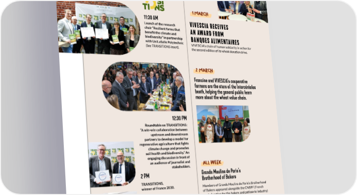 ... SIA 2024 N o une édition sous le signe de TRANSITIONS, riche en événements, S en échanges et en récompenses ! U 26 FEBrUARY C O F TRANSITIONS DAY 1 MARCh 11:30 AM VIVESCIA RECEIVES Launch of the research chair “Resilient farms that AN AWARD FROM benefit the climate and biodiversity” in partnership with UniLaSalle Polytechnic BANQUES ALIMENTAIRES (See TRANSITIONS insert). VIVESCIA’s chain of human solidarity in action for the second edition of its wheat donation drive. 2 MARCh Francine and VIVESCIA’s cooperative farmers are the stars of the Intercéréales booth, helping the general public learn more about the wheat value chain. 12:30 PM Roundtable on TRANSITIONS: “A win-win collaboration between upstream and downstream partners to develop a model for regenerative agriculture that fights climate change and promotes soil health and biodiversity.” An engaging discussion in front of an audience of journalist and aLL WEEK stakeholders. 2 PM Grands Moulins de Paris’s TRANSITIONS, Brotherhood of Bakers winner of France 2030. Members of Grands Moulins de Paris’s Brotherhood of Bakers appeared alongside the CNBPF (French 4 PM confederation for the bakery and patisserie industry) to organise demonstrations highlighting artisan bakers’ know-how to the general public. VIVESCIA takes part in INRAE’s conference: “Transitioning regional agricultural and food processing systems.” TO FIND OUT MORE, GO TO LINKEDIN 46