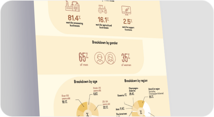 Going further BREAKDOWN OF EMPLOYEES Breakdown by business % % % 81.4 16.1 2.5 work for processing work for agricultural work for support businesses businesses functions Breakdown by gender 65% 35% of men of women Breakdown by age Breakdown by region Under 25 Champagne- years old: Ardenne: Grand Est region Over 55 6.6% 25.4% (including years old: Oceania: 1% Champagne-Ardenne): 19.1% 25.7% 25-34 years old: 22.1% Asia: 11.4% % The Americas: % 3.1% 45-54 years old: Europe France (including 25.2% 35-44 (including France): Grand Est region): years old: 84.5% 60.5% 27.1% CONSOLIDATED REPORT 2023-2024 71