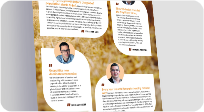 Finding new solutions We still have another 45 to 50 years of demographic growth before the global population starts to fall. We will need farmers more than The 2024 crisis revealed ever to survive this century. Our common agricultural policy is our the fragility of farms, cement; it identifies us, it emphasises what we have in common despite despite their multifaceted nature. a great diversity of situations. And yet, since 2020, we have seen the The common denominator among emergence of various national plans with a different objective: carbon farmers, wherever they are based neutrality. Agriculture is the best project there is for Europe to exist and whatever they grow, is they feel st as a power and establish a shared narrative. The challenge of the 21 helpless – from a personal, economic, century is not to produce more and more ecologically, it’s to produce and technological standpoint – with as much as we currently do, as consistently as possible, for as long as certain value chains in particular possible, and to improve our methods. SÉBASTIEN ABIS having a limited access to innovation. The demand is not just to eliminate standards, it’s more about adapting standards and public policy, making ensuring that legislation, rules and restrictions make sense… FRANÇOIS PURSEIGLE Geopolitics now dominates economics; we live in a world of passion and irrationality, which makes it more unpredictable. What Europe is missing is the ability to see itself as a global power and not just as a zone Every year is useful for understanding the best of peaceful market economies… Economic power is not sufficient, way to ensure the stability we are trying to achieve. If you look at but it is absolutely necessary for any the level of a grain production zone, recent studies in Europe and the form of power. USA have shown that the main factor that promotes stability is crop NICOLAS BOUZOU diversification. Year-long soil coverage plays a bigger role in reducing greenhouse gas emissions and protecting soils than the length of crop rotation cycles. The second factor is to look after the soil… 40% of an ecosystem’s biodiversity is found in the soil, and the healthier your soil is, the more resilient it will be. MICHEL-PIERRE FAUCON CONSOLIDATED REPORT 2023-2024 19