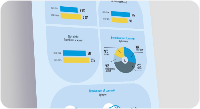 Turnover (in millions of euros) EBITDA (in millions of euros) Net debt (in millions of euros) 185 2023-2024 2023-2024 2023-2024 2022-2023 2022-2023 2022-2023 10% OTHER INDUSTRIAL ACTIVITIES 18% MILLING 30% FROZEN BAKERY Breakdown of turnover by region Breakdown of turnover by business 42% MALTING 3 001 535 149 2/3 Europe and rest of the world 1/3 France FINANCIAL INDICATORS FINANCIAL YEAR ENDING 30 JUNE 2024 % 2 863 511 07 V I V E S C I A I N D U S T R I E S S H A R E H O L D E R S N E W S L E T T E R 2 0 2 3 2 0 2 4