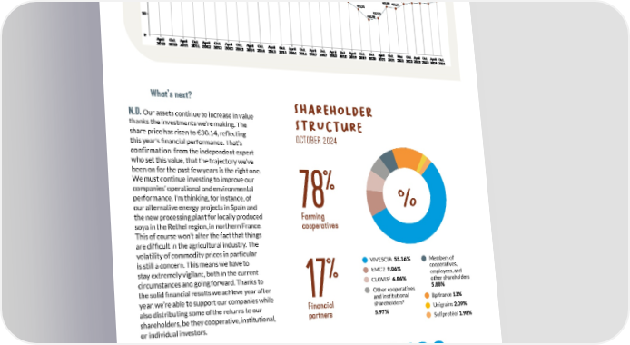 r E f E r ENC e SHAR e PRIC e 1. CLOVIS: Holding company of SCARA, Cooprative agricole de Lorraine, LORCA, and Valfrance. 2. Novagrain, Limagrain, 110 Bourgogne, Noriap, Esternay, Juniville, Interval. SHAR e H o LDE r S tr U ct UR e OCTOBER 2024 Whats next? N.D. Our assets continue to increase in value thanks the investments were making. The share price has risen to 30.14, reflecting this year's financial performance. Thats confirmation, from the independent expert who set this value, that the trajectory weve been on for the past few years is the right one. We must continue investing to improve our companies operational and environmental performance. I'm thinking, for instance, of our alternative energy projects in Spain and the new processing plant for locally produced soya in the Rethel region, in northern France. This of course won't alter the fact that things are difficult in the agricultural industry. The volatility of commodity prices in particular is still a concern. This means we have to stay extremely vigilant, both in the current circumstances and going forward. Thanks to the solid financial results we achieve year after year, were able to support our companies while also distributing some of the returns to our shareholders, be they cooperative, institutional, or individual investors. 78 % Farming cooperatives 17 % Financial partners 5 % Individual shareholders 4,180 individual shareholders at 30 June 2024 (employees and cooperative farmers, company investment fund) EMC2 9.06% Other cooperatives and institutional shareholders 2 5.97% VIVESCIA 55.16% CLOVIS 1 6.86% Unigrains 2.09% Sofiprotol 1.98% Bpifrance 13% Members of cooperatives, employees, and other shareholders 5.88% 11 VI V e S c I A I N D U S T r I e S S H A r e H O l D e r S N e W S l e T T e r 2 0 2 3