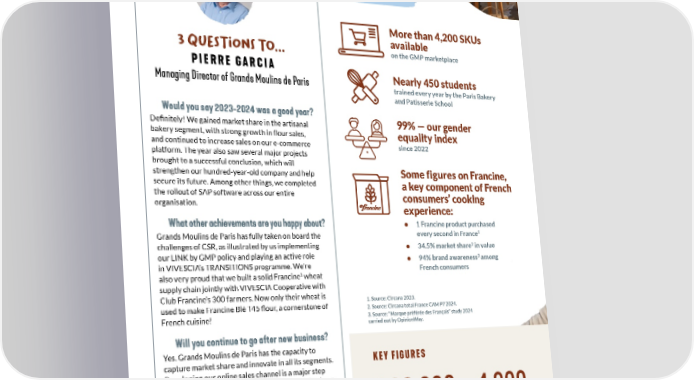 3 QU e STI o NS TO... P I E R R E G A R C I A Managing Director of Grands Moulins de Paris Would you say 2023-2024 was a good year? Definitely! We gained market share in the artisanal bakery segment, with strong growth in flour sales, and continued to increase sales on our e-commerce platform. The year also saw several major projects brought to a successful conclusion, which will strengthen our hundred-year-old company and help secure its future. Among other things, we completed the rollout of SAP software across our entire organisation. What other achievements are you happy about? Grands Moulins de Paris has fully taken on board the challenges of CSR, as illustrated by us implementing our LINK by GMP policy and playing an active role in VIVESCIAs TRANSITIONS programme. We're also very proud that we built a solid Francine 1 wheat supply chain jointly with VIVESCIA Cooperative with Club Francines 300 farmers. Now only their wheat is used to make Francine Bl T45 flour, a cornerstone of French cuisine! Will you continue to go after new business? Yes. Grands Moulins de Paris has the capacity to capture market share and innovate in all its segments. Developing our online sales channel is a major step forward in reaching our objectives. We intend to keep leveraging this while continuing to provide a high level of support to artisan bakers through our new customer relations programme, GMP PLUS, which all our customers can sign up to. On a final note, our iconic Francine brand will be celebrating its 60 th anniversary next year. Watch out for lots of events to mark this milestone anniversary! MILLING More than 4,200 SKUs available on the GMP marketplace Nearly 450 students trained every year by the Paris Bakery and Patisserie School 99% our gender equality index since 2022 Some figures on Francine, a key component of French consumers cooking experience: 1 Francine product purchased every second in France 1 34.5% market share 2 in value 94% brand awareness 3 among French consumers HIG hl IG h T s ... K E Y F I G U R E S 600,000 tonnes of flour produced on average every year 1. Source: Circana 2023. 2. Source: Circana total France CAM P7 2024 . 3. Source: Marque prfre des Franais study 2024 carried out by OpinionWay. 1. Environmental certification level 2 minimum. 1,000+ employees in France 16