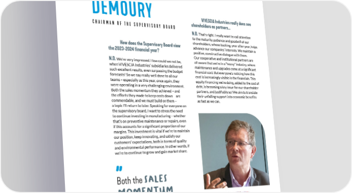 3 QU e STI o NS FO r NICOLAS DEMOURY C H A I R M A N O F T H E S U P E R V I S O R Y B O A R D How does the Supervisory Board view the 2023-2024 financial year? N.D. Were very impressed. How could we not be, when VIVESCIA Industries subsidiaries delivered such excellent results, even surpassing the budget forecasts! So we say really well done to all our teams especially as this year, once again, they were operating in a very challenging environment. Both the sales momentum they achieved and the efforts they made to keep costs down are commendable, and we must build on them a topic Ill return to later. Speaking for everyone on the supervisory board, I want to stress the need to continue investing in manufacturing whether thats on preventive maintenance or repairs, even if this accounts for a significant proportion of our margins. This investment is vital if were to maintain our position, keep innovating, and satisfy our customers expectations, both in terms of quality and environmental performance. In other words, if were to continue to grow and gain market share. VIVESCIA Industries really does see shareholders as partners... N.D. That's right. I really want to call attention to the maturity, patience and goodwill of our shareholders, whose backing, year after year, helps advance our companies interests. We maintain a positive, constructive dialogue with them. Our cooperative and institutional partners are all aware that were in a heavy industry, where maintenance and upgrades come at a significant financial cost. But everyones noticing how this cost is increasingly visible in the financials. This equity financing were doing, added to the cost of debt, is becoming a key issue for our shareholder partners, and justifiably so! We aim to translate their unfailing support into economic benefits as fast as we can. Both the SALES MOMEN t UM they achieved and the efforts they made to keep costs down AR e c OMM e NDABL e . " " 10