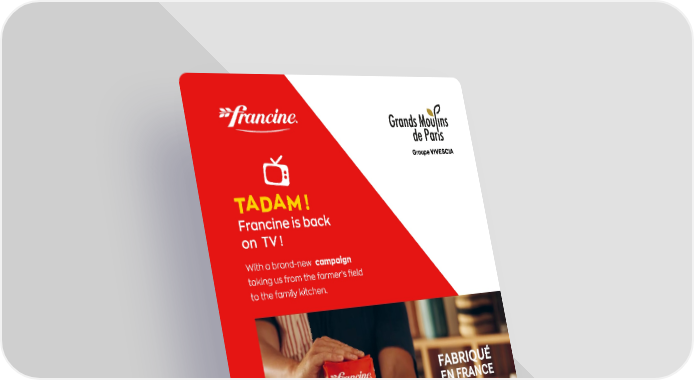TA DA M ! Francine is back on TV ! With a brand-new campaign taking us from the farmer’s field to the family kitchen. Eat at least five servings of fruit or vegetables per day. www.mangerbouger.fr WATCh ScAN TO