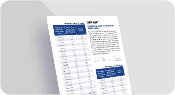 57 SUMMARY PLAN DESCRIPTION 2023 // Percentage of your benefit payable Number of years your spouse is older or younger than you Normal, Early, 30 and Out, 20 and Age 62, or Vested Deferred Pension* Disability Pension** 10 years older 94.0% 86.0% 9 years older 93.6 85.6 8 years older 93.2 85.2 7 years older 92.8 84.8 6 years older 92.4 84.4 5 years older 92.0 84.0 4 years older 91.6 83.6 3 years older 91.2 83.2 2 years older 90.8 82.8 1 year older 90.4 82.4 SAME AGE 90.0 82.0 1 year younger 89.6 81.6 2 years younger 89.2 81.2 3 years younger 88.8 80.8 4 years younger 88.4 80.4 5 years younger 88.0 80.0 6 years younger 87.6 79.6 7 years younger 87.2 79.2 8 years younger 86.8 78.8 9 years younger 86.4 78.4 10 years younger 86.0 78.0 Maximum benefit payable is 99% Maximum benefit payable is 91% For age differences greater than 10 years, contact the Fund Office. * If covered by the Preferred Schedule, multiply result by 0.97879; if by the Default Schedule, by 0.98649 for benefits accrued after Default Schedule Effective Date. ** If covered by the Preferred Schedule or Default Schedule, multiply your result by 0.9330 (for benefits accrued after the Default Schedule Effective Date). TABLE EIGHT DETERMINING THE AMOUNT OF A 75% JOINT AND SURVIVOR PENSION First, calculate your pension benefit, including any applicable age re- duction. Then determine the number of years your spouse is older or younger than you and locate that number in the first column. To the right of the first column are two columns containing percentage fig- ures. Select the column that describes the type of pension applicable to you and the percentage that corresponds to the number of years your spouse is older or younger than you. Multiply that percentage by the amount of your pension benefit. If you are subject to an RP Schedule, multiply that amount by the RP % noted below the table. The result is the amount of your pension under the 75% Joint and Survivor Pension form of payment. When you die, your spouse will continue to receive 75% of that amount. $ __ ____ x ____ x ____ = $ __________ Your Benefit Age % RP % 75% Joint and Survivor Pension Percentage of your benefit payable Number of years your spouse is older or younger than you Normal, early, 30 and Out, 20 and Age 62 or Vested Deferred Pension* Disability Pension** 10 years older 91.0% 79.0% 9 years older 90.4% 78.5% 8 years older 89.8% 78.0% 7 years older 89.2% 77.5% 6 years older 88.6% 77.0% 5 years older 88.0% 76.5% 4 years older 87.4% 76.0% 3 years older 86.8% 75.5% 2 years older 86.2% 75.0% 1 year older 85.6% 74.5% Same Age 85.0% 74.0% 1 year younger 84.4% 73.5% 2 years younger 83.8% 73.0% 3 years younger 83.2% 72.5% 4 years younger 82.6% 72.0% 5 years younger 82.0% 71.5% 6 years younger 81.4% 71.0%