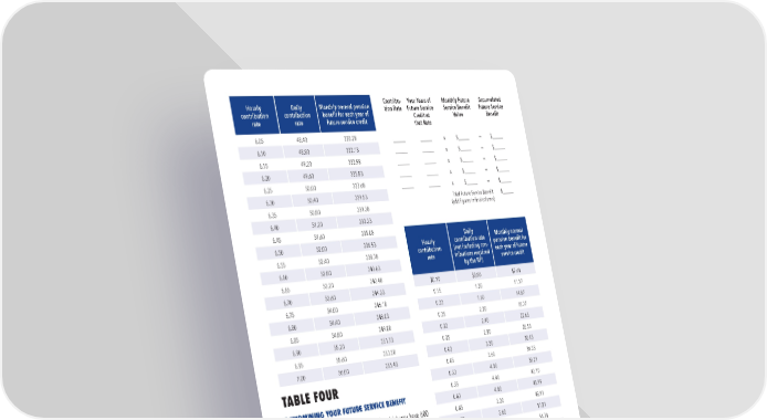 51 SUMMARY PLAN DESCRIPTION 2023 // Hourly contribution rate Daily contribution rate Monthly normal pension benefit for each year of future service credit 6.05 48.40 320.28 6.10 48.80 322.13 6.15 49.20 323.98 6.20 49.60 325.83 6.25 50.00 327.68 6.30 50.40 329.53 6.35 50.80 331.38 6.40 51.20 333.23 6.45 51.60 335.08 6.50 52.00 336.93 6.55 52.40 338.78 6.60 52.80 340.63 6.65 53.20 342.48 6.70 53.60 344.33 6.75 54.00 346.18 6.80 54.40 348.03 6.85 54.80 349.88 6.90 55.20 351.73 6.95 55.60 353.58 7.00 56.00 355.43 TABLE FOUR DETERMINING YOUR FUTURE SERVICE BENEFIT Use this table if the latest calendar year for which you have 600 hours of service is 1996. To determine your future service benefit, first find your employ- er’s hourly or daily contribution rate (not including contributions required by the RP). To the right of that rate is the corresponding benefit value. Multiply that value by your years of future service credit at that rate. Follow the same procedure for each contribution rate. If you do not earn a full year of service credit in any calendar year, you will receive a prorated amount based on the months of future service you earned. Contribu- tion Rate Your Years of Future Service Credit at that Rate Monthly Future Service Benefit Value Accumulated Future Service Benefit _____ _____ x $_____ = $_____ _____ _____ x $_____ = $_____ _____ _____ x $_____ = $_____ _____ _____ x $_____ = $_____ _____ _____ x $_____ = $_____ Total Future Service Benefit (add figures in final column) $_____ Hourly contribution rate Daily contribution rate (not including con- tributions required by the RP) Monthly normal pension benefit for each year of future service credit $0.10 $0.80 $7.44 0.15 1.20 11.17 0.20 1.60 14.87 0.25 2.00 18.77 0.30 2.40 22.65 0.35 2.80 26.55 0.40 3.20 30.45 0.45 3.60 34.33 0.50 4.00 38.21 0.55 4.40 42.10 0.60 4.80 45.99 0.65 5.20 48.91 0.70 5.60 51.81 0.75 6.00 54.74 0.80 6.40 57.64 0.85 6.80 60.16 0.90 7.20 62.72 0.95 7.60 65.24 1.00 8.00 67.78 1.05 8.40 69.89 1.10 8.80 72.01 1.15 9.20 74.91 1.20 9.60 78.00