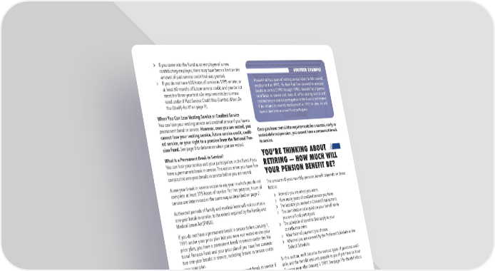 10 \\ How Much Will Your Pension Benefit Be? › If you came into the Fund as an employee of a new contributing employer, there may have been a limit on the amount of past service credit that was granted. › If you do not have 600 hours of service in 1995 or later, or at least 60 months of future service credit, and you do not meet the three-year test rule requirements (as summa- rized under If Past Service Credit Was Granted, When Do You Qualify for It? on page 9). When You Can Lose Vesting Service or Credited Service You can lose your vesting service and credited service if you have a permanent break in service. However, once you are vested, you cannot lose your vesting service, future service credit, credit- ed service, or your right to a pension from the National Pen- sion Fund. See page 8 to determine when you are vested. What Is a Permanent Break in Service? You can lose your service and your participation in the Fund if you have a permanent break in service. This occurs when you have five consecutive one-year breaks in service before you are vested. A one-year break in service occurs in any year in which you do not complete at least 375 hours of service. For this purpose, hours of service are determined in the same way as described on page 7. Authorized periods of family and medical leave will not count as a one-year break in service, to the extent required by the Family and Medical Leave Act (FMLA). If you do not have a permanent break in service before January 1, 1991 under your prior plan but you were not vested under your prior plan, you have a permanent break in service under the Na- tional Pension Fund and your prior plan if you have five consecu- tive one-year breaks in service, including breaks in service under your prior plan. For years before 1991, you have a permanent break in service if you had a permanent break under your prior plan. See your prior plan SPD. Once you have met all the requirements for a normal, early, or vested deferred pension, you cannot have a permanent break in service. YOU’RE THINKING ABOUT RETIRING — HOW MUCH WILL YOUR PENSION BENEFIT BE? The amount of your monthly pension benefit depends on these factors: › How old you are when you retire. › How many years of credited service you have. › The last date you worked in Covered Employment. › The contribution rates paid on your behalf while you are a Fund participant. › The schedule of benefits that apply to your contribution rates. › What form of payment you choose. › Whether you are covered by the Preferred Schedule or the Default Schedule. In this section, we’ll describe the various types of pensions avail- able, and the benefit amounts payable to you if you have an hour of service on or after January 1, 1991. See page 7 for the definition of an hour of service. ACTUARIAL PRESENT VALUE The term actuarial present value is used occasionally in this Summary Plan Description. It refers to a single dollar value placed on benefits expected to be payable, based on projections of life expectancy and future investment earnings, and the terms of the Plan Document. NORMAL PENSION You are eligible to receive a normal pension if: › You are at least 65, and FOR EXAMPLE Paul had three years of vesting service when he left covered em- ployment in 1992. He had three consecutive one-year breaks in service in 1993, 1994 and 1995. He returns to work in covered employment in 1996. Since Paul did not have five consecutive one-year breaks in service, he does not have a permanent break in service. He can add his three years of vesting service before the one-year breaks to any additional vesting service he then earns. ANOTHER EXAMPLE Howard had four years of vesting service when he left covered employment in 1991. He then had five consecutive one-year breaks in service (1992 through 1996). Howard has a perma- nent break in service and loses all of his vesting service and credited service and his participation in the Fund is terminated. If he returns to covered employment in 1997 or later, he will have to start over as a new Fund participant.