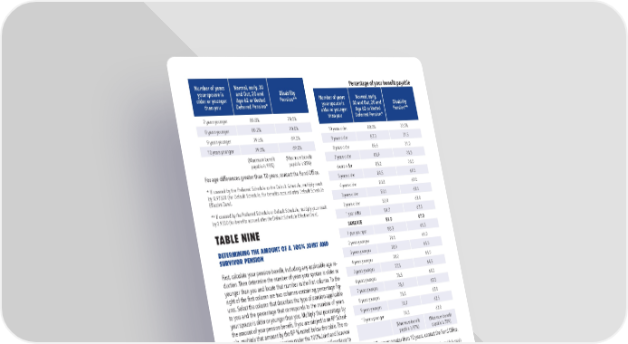 58 \\ Appendix Number of years your spouse is older or younger than you Normal, early, 30 and Out, 20 and Age 62 or Vested Deferred Pension* Disability Pension** 7 years younger 80.8% 70.5% 8 years younger 80.2% 70.0% 9 years younger 79.6% 69.5% 10 years younger 79.0% 69.0% (Maximum benefit payable is 99%) (Maximum benefit payable is 85%) For age differences greater than 10 years, contact the Fund Office. * If covered by the Preferred Schedule or the Default Schedule, multiply result by 0.97500 (for Default Schedule, for benefits accrued after Default Schedule Effective Date). ** If covered by the Preferred Schedule or Default Schedule, multiply your result by 0.9330 (for benefits accrued after the Default Schedule Effective Date). TABLE NINE DETERMINING THE AMOUNT OF A 100% JOINT AND SURVIVOR PENSION First, calculate your pension benefit, including any applicable age re- duction. Then determine the number of years your spouse is older or younger than you and locate that number in the first column. To the right of the first column are two columns containing percentage fig- ures. Select the column that describes the type of pension applicable to you and the percentage that corresponds to the number of years your spouse is older or younger than you. Multiply that percentage by the amount of your pension benefit. If you are subject to an RP Sched- ule, multiply that amount by the RP % noted below the table. The re- sult is the amount of your pension under the 100% Joint and Survivor Pension form of payment. When you die, your spouse will continue to receive 100% of that amount. $ __ ____ x ____ x ____ = $ __________ Your Benefit Age % RP % 100% Joint and Survivor Pension Percentage of your benefit payable Number of years your spouse is older or younger than you Normal, early, 30 and Out, 20 and Age 62 or Vested Deferred Pension* Disability Pension** 10 years older 88.0% 72.0% 9 years older 87.3 71.5 8 years older 86.6 71.0 7 years older 85.9 70.5 6 ears older 85.2 70.0 5 years older 84.5 69.5 4 years older 83.8 69.0 3 years older 83.1 68.5 2 years older 82.4 68.0 1 year older 81.7 67.5 SAME AGE 81.0 67.0 1 year younger 80.3 66.5 2 years younger 79.6 66.0 3 years younger 78.9 65.5 4 years younger 78.2 65.0 5 years younger 77.5 64.5 6 years younger 76.8 64.0 7 years younger 76.1 63.5 8 years younger 75.4 63.0 9 years younger 74.7 62.5 10 years younger 74.0 62.0 (Maximum benefit payable is 97%) (Maximum benefit payable is 78%) For age differences greater than 10 years, contact the Fund Office. * If covered by the Preferred Schedule or the Default Schedule, multiply result by 0.97500 (for Default Schedule, for benefits accrued after Default Schedule Effective Date). ** If covered by the Preferred Schedule or Default Schedule, multiply your result by 0.9330 (for benefits accrued after the Default Schedule Effective Date).