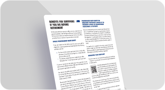 22 \\ Benefits for Survivors BENEFITS FOR SURVIVORS IF YOU DIE BEFORE RETIREMENT To help you protect your spouse or other survivors, certain forms of payment available under the National Pension Fund provide bene- fits for survivors when you die after retirement. The Fund also offers protection for your survivors if you die before retirement. SPOUSE PRERETIREMENT DEATH BENEFIT If you are married and die before you retire, your spouse will be eligible for a spouse preretirement death benefit if the following conditions are met: › You have met the service requirements for a normal, early retirement, 30 and Out, 20 and Age 62, or vested deferred pension before you die. › You and your spouse have been married to each other throughout the 12-month period ending with your death. If you are married and die before you retire, payments to your spouse can be effective the first of the month following receipt of your spouse’s application for benefits. Your spouse may defer receiving this benefit until a future date, but no later than the end of the calendar year in which you would have been 72 years old (or 70½ years old if you reached age 70½ before January 1, 2020). The amount of this benefit will be a monthly lifetime payment to your spouse calculated as if you had retired on a 100% Joint and Survivor Pension (50% Joint and Survivor Pension if the partici- pant died before April 17, 2019). The benefit is based on your age on the effective date of your spouse’s benefit. If the benefit is to be paid before you would have reached age 55 and you had not become eligible for the 30 and Out pension benefit, the benefit amount will be determined as if you had reached age 55. You do not need to elect this benefit during your lifetime. Your spouse must, however, apply for this benefit after your death by filing an application with the Fund Office. Benefits to your spouse cannot be paid for any period before the first of the month after a completed application is received by the Fund Office. If the actuarial present value of the spouse preretirement death benefit is $5,000 or less, the Trustees will automatically pay your spouse a single cash payment. To be eligible for the spouse preretirement death benefit you must have at least one hour of service under the National Pension Fund or a prior plan on or after September 2, 1974. PRERETIREMENT DEATH BENEFIT FOR UNMARRIED PARTICIPANTS COVERED BY THE PREFERRED SCHEDULE OR GRANDFATHERED PARTICIPANTS: 60 PAYMENTS If you are a vested participant who is covered by the Preferred Sched- ule or a Grandfathered Participant and you die before retirement, your beneficiary or beneficiaries will be eligible for a monthly pre- retirement death benefit if you are unmarried or were not married throughout the 12-month period ending on your date of death (if you were married throughout the 12-month period ending on the date of your death, the spouse preretirement benefit is payable in- stead). This benefit, which is payable for 60 months, is equal to the normal pension amount you would have received had you retired the day before your death. It is payable beginning the first day of the month following the receipt of your beneficiary’s application. DESIGNATING YOUR BENEFICIARY If you are unmarried, it is important that you designate a beneficiary — the person or persons who will receive this 60-payment death ben- efit when you die. A beneficiary designation form can be found at the rear of this booklet or can be downloaded from the Fund website at www.iamnpf.org. You may also designate or update your beneficiary designation online at www.iamnpf.org. Your completed, form must be on file at the Fund Office to be valid. There is no limit on the number of beneficiaries you may designate. If you do not name a beneficiary, or if your last surviving beneficia- ry has died before all 60 monthly payments are made, your death benefits will be paid to the persons listed below in the order and manner listed: › To your surviving spouse (that is, to whom you were mar- ried for less than 12 months) › If no surviving spouse, to your surviving children, divided equally › If no surviving spouse or children, to your surviving par- ents, divided equally › If no surviving spouse, children, or parents, to your surviv- ing siblings, divided equally For the purposes of this section, “children” or “surviving children” means your surviving biological or legally adopted children.