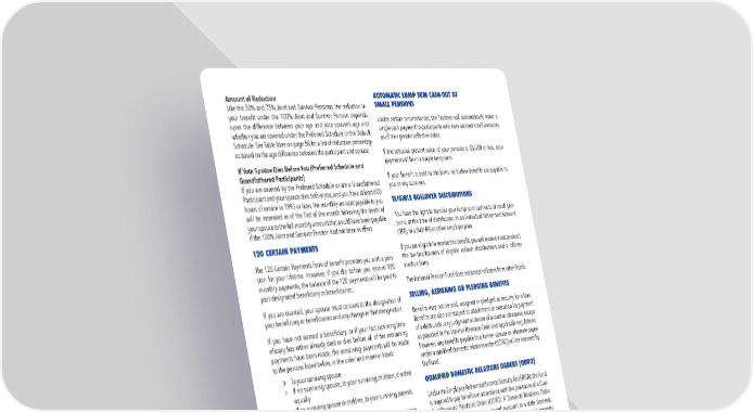 21 SUMMARY PLAN DESCRIPTION 2023 // Amount of Reduction Like the 50% and 75% Joint and Survivor Pensions, the reduction in your benefit under the 100% Joint and Survivor Pension depends upon the difference between your age and your spouse’s age and whether you are covered under the Preferred Schedule or the Default Schedule. See Table Nine on page 58 for a list of reduction percentag- es based on the age difference between the participant and spouse. If Your Spouse Dies Before You (Preferred Schedule and Grandfathered Participants) If you are covered by the Preferred Schedule or are a Grandfathered Participant and your spouse dies before you, and you have at least 600 hours of service in 1993 or later, the monthly amount payable to you will be increased as of the first of the month following the death of your spouse to the full monthly amount that would have been payable if the 100% Joint and Survivor Pension had not been in effect. 120 CERTAIN PAYMENTS The 120 Certain Payments form of benefit provides you with a pen- sion for your lifetime. However, if you die before you receive 120 monthly payments, the balance of the 120 payments will be paid to your designated beneficiary or beneficiaries. If you are married, your spouse must consent to the designation of your beneficiary or beneficiaries and any change in that designation. If you have not named a beneficiary, or if your last surviving ben- eficiary has either already died or dies before all of the remaining payments have been made, the remaining payments will be made to the persons listed below, in the order and manner listed: › To your surviving spouse › If no surviving spouse, to your surviving children, divided equally › If no surviving spouse or children, to your surviving parents, divided equally › If no surviving spouse, children, or parents, to your surviving siblings, divided equally If none of these persons are living, the remaining monthly payments will be made to the estate of the last surviving beneficiary, or if none, to your estate. For the purposes of this section, “children” or “surviving children” means your surviving biological or legally adopted children. Amount of Reduction There is a reduction in your benefit to provide the 120 Certain Pay- ments option. See Table Ten on page 59 for percentage reductions based on your age at retirement. AUTOMATIC LUMP SUM CASH-OUT OF SMALL PENSIONS Under certain circumstances, the Trustees will automatically make a single cash payment to participants who have accrued small pensions as of their pension effective dates. If the actuarial present value of your pension is $5,000 or less, your payment will be in a single lump sum. If your benefit is paid in this form, no further benefits are payable to you or any survivors. ELIGIBLE ROLLOVER DISTRIBUTIONS You have the right to transfer your lump sum cash-outs of small pen- sions, at the time of distribution, to an Individual Retirement Account (IRA), to a Roth IRA or other employer plan. If you are eligible to receive this benefit, you will receive a notice about the tax implications of eligible rollover distributions and a rollover election form. The National Pension Fund does not accept rollovers from other Funds. SELLING, ASSIGNING OR PLEDGING BENEFITS Benefits may not be sold, assigned or pledged as security for a loan. Benefits are also not subject to attachment or execution for payment of a debt under any judgment or decree of a court or otherwise, except as provided in the Internal Revenue Code and applicable regulations. However, any benefits payable to a former spouse or alternate payee under a qualified domestic relations order (QDRO) will be honored by the Fund. QUALIFIED DOMESTIC RELATIONS ORDERS (QDRO) Under the Employee Retirement Income Security Act (ERISA), the Fund is required to pay benefits in accordance with the provisions of a Qual- ified Domestic Relations Order (QDRO). A Domestic Relations Order (DRO) is a court order which is issued pursuant to a state domestic relations law, and which relates to the provisions of marital property rights. In order to be considered a QDRO the order must contain cer- tain specific provisions with respect to benefits under the Fund. When the Fund receives a DRO, it follows specific procedures as required by ERISA in determining whether a domestic relations order is qualified. Upon request, and without charge, the Fund Office will provide the Fund procedures and requirements for Qualified Domestic Relations Orders. This information is also available on the Fund’s website at www.iamnpf.org under “National Pension Fund” ® “QDROs.”