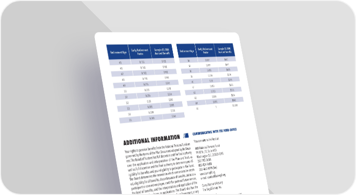 64 \\ Appendix Retirement Age Early Retirement Factor Sample $1,000 Accrued Benefit 45 0.155 $155 46 0.168 $168 47 0.182 $182 48 0.198 $198 49 0.216 $216 50 0.235 $235 51 0.256 $256 52 0.28 $280 53 0.305 $305 54 0.334 $334 55 0.366 $366 Retirement Age Early Retirement Factor Sample $1,000 Accrued Benefit 56 0.401 $401 57 0.441 $441 58 0.485 $485 59 0.534 $534 60 0.59 $590 61 0.653 $653 62 0.723 $723 63 0.804 $804 64 0.895 $895 65 1 $1,000 ADDITIONAL INFORMATION Your rights to pension benefits from the National Pension Fund are governed by the terms of the Plan Document adopted by the Trust- ees. The Board of Trustees has full discretion and the final authority over the application and interpretation of the Plan and Trust, as well as full discretion and the final authority to determine your el- igibility for benefits and your eligibility to participate in the Fund. The Board determines the manner in which service is to be credit- ed, eligibility for all benefits, discontinuance of benefits, status as a participant or covered employee, credit for past and future service, the level of benefits, and the interpretation and application of the Fund to particular claims or applications. The Board also has the discretion to amend or modify the Fund or Trust Agreement, or any of their provisions, in whole or in part, at any time. No person or organization, no union officer, district or lodge em- ployee, employer or employee representative, or consultant or at- torney is authorized to speak on behalf of the Board of Trustees on any matter related to the National Pension Fund. There is no guarantee that pensions will be increased after retirement, even if benefits are increased for active participants. The Trustees may provide benefit increases to retirees, but they are not required to do so. The Fund is required by law to provide you with this Summary Plan Description (SPD). It is intended to be a simplified version of the official Plan document. The Plan Document, as interpreted by the Board of Trustees, is the final authority. If anything in the SPD is not clear to you, please ask the Fund Office for an explanation. COMMUNICATING WITH THE FUND OFFICE You can write to the Fund at: IAM National Pension Fund 99 M St., SE, Suite 600 Washington D.C. 20003-4595 202-785-2658 800-424-9608 202-463-8098 (fax) www.iamnpf.org e-mail: [email protected] Consultant and Actuary The Segal Group, Inc. Legal Counsel Raymond E. Goad, Jr., General Counsel P.C. Auditor Novak Francella LLC Executive Director Ryk Tierney, CEBS