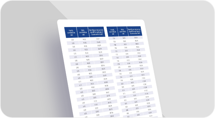 46 \\ Appendix Hourly contribution rate Daily contribution rate Monthly normal pension benefit for each year of future service credit 5.50 44.00 314.91 5.55 44.40 316.85 5.60 44.80 318.79 5.65 45.20 320.74 5.70 45.60 322.69 5.75 46.00 324.62 5.80 46.40 326.57 5.85 46.80 328.51 5.90 47.20 330.46 5.95 47.60 332.40 6.00 48.00 334.35 6.05 48.40 336.29 6.10 48.80 338.24 6.15 49.20 340.18 6.20 49.60 342.12 6.25 50.00 344.06 6.30 50.40 346.01 6.35 50.80 347.95 6.40 51.20 349.89 6.45 51.60 351.83 6.50 52.00 353.78 6.55 52.40 355.72 6.60 52.80 357.66 6.65 53.20 359.60 6.70 53.60 361.55 6.75 54.00 363.49 6.80 54.40 365.43 6.85 54.80 367.37 6.90 55.20 369.32 6.95 55.60 371.26 7.00 56.00 373.20 7.05 56.40 375.14 7.10 56.80 377.08 7.15 57.20 379.02 7.20 57.60 380.96 7.25 58.00 382.90 Hourly contribution rate Daily contribution rate Monthly normal pension benefit for each year of future service credit 7.30 58.40 384.84 7.35 58.80 386.78 7.40 59.20 388.72 7.45 59.60 390.66 7.50 60.00 392.60 7.55 60.40 394.54 7.60 60.80 396.48 7.65 61.20 398.42 7.70 61.60 400.36 7.75 62.00 402.30 7.80 62.40 404.24 7.85 62.80 406.18 7.90 63.20 408.12 7.95 63.60 410.06 8.00 64.00 412.00 8.05 64.40 413.94 8.10 64.80 415.88 8.15 65.20 417.82 8.20 65.60 419.76 8.25 66.00 421.70 8.30 66.40 423.64 8.35 66.80 425.58 8.40 67.20 427.52 8.45 67.60 429.46 8.50 68.00 431.40 8.55 68.40 433.34 8.60 68.80 435.28 8.65 69.20 437.22 8.70 69.60 439.16 8.75 70.00 441.10 8.80 70.40 443.04 8.85 70.80 444.98 8.90 71.20 446.92 8.95 71.60 448.86 9.00 72.00 450.80 9.05 72.40 452.74