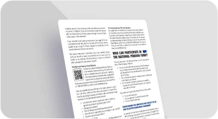 5 SUMMARY PLAN DESCRIPTION 2023 // employer reports. It also shows your total credited service and vest- ing service. In addition, if you were covered by a plan that merged with the National Pension Fund, your pre-merger service will gen- erally appear on the statement. If you meet the Fund’s vesting requirements (see page 8), the an- nual statement will also show an estimate of the normal pension payable to you at age 65. Please compare the information on the annual statement with your own records. The annual statement’s information about your credited service and your benefit is based on unverified records and should be treated as an estimate. All information is subject to verification when you apply for your pension benefit. The National Pension Fund Website To learn more about the National Pension Fund, vis- it our website at www.iamnpf.org. The Fund’s web- site is a valuable resource to aid you in obtaining information about your benefits and is designed to maintain the security of your personal information. If you have any questions about using the website, call the Fund Office at 1-800-424-9608 or e-mail us at [email protected]. One very valuable tool you will find on the Fund’s website is a pen- sion calculator, which permits active participants to project their benefits according to varying contribution rates and retirement-age scenarios. On the website participants can also: › Complete your pension application online, including uploading pertinent supporting documents* › Change your address* › View or change your beneficiary designations* › View the hours reported by your employer on your behalf* › Request a pension application* › Print various forms * Once you start receiving your pension benefit, these features will not be available to you online, but you may use the following features when accessing the website: › Sign-up for Direct Deposit › Download a Form 1099R › Print a Verification of Income statement › Update tax withholding information › View monthly benefit payments You are solely responsible for maintaining the security of any of your passwords associated with the Plan. You can help protect your personal information following the online security tips rec- ommended by the Department of Labor and found here: https:// www.dol.gov/sites/dolgov/files/ebsa/key-topics/retirement-bene- fits/cybersecurity/online-security-tips.pdf You Have Questions, We Have Answers As you get closer to retirement, you may want more specific informa- tion about the amount of your benefit and the options available to you. If you have specific questions regarding your benefit, please write to the Fund Office at the address shown on the back cover. For general questions regarding the National Pension Fund, you may write to the Fund Office or call the Fund at 1-800-424-9608 between the hours of 9:00 a.m. and 7:00 p.m. eastern time. You may also e-mail questions to us at [email protected]. WHO CAN PARTICIPATE IN THE NATIONAL PENSION FUND? You can participate in the National Pension Fund if you meet all three of the following conditions: › You are represented for the purpose of collective bargain- ing by a lodge chartered by the IAM. The collective bar- gaining agreement may be with another union if accepted by the Trustees. › Your employer has agreed in writing to make contributions to the Fund on your behalf. › Your employer is accepted, in writing, as a contribut- ing employer by the Board of Trustees, and makes the required contributions. You cannot participate in the National Pension Fund while: › You are self-employed › You are a partner of a contributing employer › You are a leased employee PARTICIPATION FOR EMPLOYEES NOT SUBJECT TO AN IAM COLLECTIVE BARGAINING AGREEMENT In general, the Fund covers employees who are working under a collective bargaining agreement. Some exceptions do apply. If the Trustees agree to their participation, employees of certain entities may be covered. Such entities include: › A local or district lodge › A related welfare fund › Another union-affiliated organization › A conjoint union › Non-union and management employees of a regular con- tributing employer (subject to certain conditions) In each such case, the Trustees require a signed special participa- tion agreement from the employer. In addition, the employees of the Fund Office are covered by the Fund.