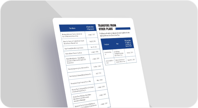 32 \\ Transfers From Other Plans Plan Name Effective Date of Agreement Montana Retirement Plan for International Assn. Of Machinists Pension Trust January 1, 1977 Motor Car Dealers of Greater Kansas City and Union Pension Plan and Trust May 12, 1992 Paper Novelty Manufacturing Company April 1, 1971 Pattern Makers’ Pension Trust Fund January 1, 1998 Pattern Manufacturers — Pattern Makers Association of Detroit and Vicinity, AFL-CIO Pension Fund January 1, 2001 Peabody Engineering Corp. Retirement Plan October 1, 1970 Pearl Brewing Co. Brewery Workers Pension Plan July 1, 1971 Pennsylvania Forge Company Pension Plan May 1, 1963 Pension Plan for Designated Hourly Employees of the Arnold Engineering Co. January 1, 2008 Pension Plan of Muskegon Area Pattern Manufacturers and Patternmakers Association of Muskegon January 1, 1993 Retirement Plan for Hourly and Maintenance Employees of the Engineered Products Division of Royal Industries, Inc. January 1, 1971 Starline, Inc. Pension and Disability Plan for Hourly Employees April 1, 1973 Superior Die Casting Corp District 54 IAM Retirement Income Plan July 1, 1977 Todd Pacific Shipyards Corporation, Los Angeles Division and I.U.M.S.U.A. and its Local No. 9 Pension Plan January 1, 2001 Todd Shipyards Corporation & Retirement System, Todd GalvestonComponent July 1, 2002 Toledo Auto Dealers Association Retirement Plan August 1, 1976 TRANSFERS FROM OTHER PLANS Employers with certain employees who were transferred to the National Pension Fund from other Plans Employer Plan Effective Date of Transfer to the National Pension Fund Kistler Ford Sales Inc. Central States, Southeast & Southwest Areas Pension Fund January 1, 2014 Continental Micro- nesia Western Conference of Teamsters Pension Trust November 1, 2013