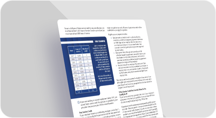9 SUMMARY PLAN DESCRIPTION 2023 // To earn a full year of future service credit in any calendar year, you must have at least 1,601 hours of service. To earn a partial year, you must have at least 600 hours of service. If you were working in covered employment before 1991, you earned future service credit for each year as provided by your prior plan. See your prior plan SPD for more information. Past Service Credit If your employer became a contributing employer prior to April 1, 2003, you may be eligible for past service credit for time you worked for an employer that later became a contributing employer. In some cases, the Trustees determined that past service credit was limited or not granted at all, based on the age and service of the employees at the time of initial participation. Past service credit is not available to new groups who joined the Fund on or after April 1, 2003. How You May Earn Past Service Credit If the date on which your employer first started contributing to the Fund is in 1991 or later, but not after April 1, 2003, you may earn one year of past service credit for each year you worked at least 135 days in eligible past employment for an employer that became a contributing employer. If your employer first started contributing to the Fund on your behalf before January 1, 1991, please refer to your prior plan SPD for infor- mation on past service credit. All years of past service credit will be verified when you apply for a pension. Eligible past employment includes: › Employment at a location and in a job classification covered by a collective bargaining agreement between an IAM lodge and an employer that later becomes a contributing employer or in a job classification later covered in a written participation agreement approved by the Trustees. › Employment that, although not covered by an IAM collective bargaining agreement, was performed in a job classification and at a place of business, both of which were later covered by a collective bargaining agreement between the lodge and that employer. › Employment with an employer that went out of busi- ness and was taken over by a contributing employer, or employment in any comparable situations, if approved by the Trustees, may also be considered eligible past employment. Past service credit is also granted for eligible military service if you left eligible past employment to enter military service and, upon your release from the service, you applied for and obtained work in eligible Covered Employment. If Past Service Credit Was Granted, When Do You Qualify for It? If past service credit was granted at the time of your employer’s acceptance in the Fund, you qualify for it once you have 600 hours of service in any Fund year beginning 1995 or later. If you do not meet this service requirement, you will qualify for past ser- vice credit — if any was granted — once you complete at least 60 months of future service credit. However, if you do not meet either of these conditions, you may still be eligible for past service credit if you satisfy the three-year test rule requirement: that is, if you worked at least 135 days in eligible past employment in each of the three calendar years preceding the calendar year of your employer’s contribution date. When Past Service Credit Can Be Denied or Canceled Past service credit can be denied, limited, or canceled for any of the following reasons: › You have a permanent break in service. See “What Is a Permanent Break in Service?” on page 10. › You did not work at least 135 days in eligible past employ- ment in any period of five consecutive calendar years. If this applies to you, you will not receive past service credit for any employment before the five-year period. FOR EXAMPLE John’s employer was required to make contri- butions to the Fund on John’s behalf beginning in March 2007. As John continues working for a contributing employer, his annual hours of service translate into months of future service credit as reflected in this chart: John has 126 months, or 10 years and six months of future service credit. Years Hours of service Months of credit 2007 1,200 9 2008 1,500 11 2009 2,080 12 2010 2,080 12 2011 1,500 11 2012 1,850 12 2013 2,080 12 2014 1,600 11 2015 2,080 12 2016 2,080 12 2017 1,850 12 Total 126