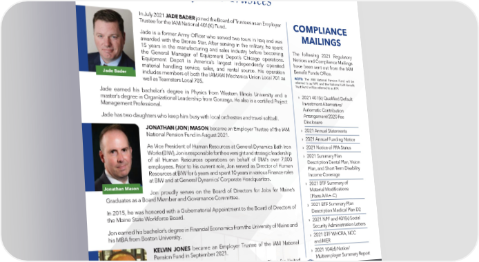 4 In July 2021 JADE BADER joined the Board of Trustees as an Employer Trustee for the IAM National 401(K) Fund. Jade is a former Army Officer who served two tours in Iraq and was awarded with the Bronze Star. After serving in the military, he spent 15 years in the manufacturing and sales industry before becoming the General Manager of Equipment Depot’s Chicago operations. Equipment Depot is America’s largest independently operated material handling service, sales, and rental source. His operation includes members of both the IAMAW Mechanics Union Local 701 as well as Teamsters Local 705. Jade earned his bachelor’s degree in Physics from Western Illinois University and a master’s degree in Organizational Leadership from Gonzaga. He also is a certified Project Management Professional. Jade has two daughters who keep him busy with local orchestras and travel softball. JONATHAN (JON) MASON became an Employer Trustee of the IAM National Pension Fund in August 2021. As Vice President of Human Resources at General Dynamics Bath Iron Works (BIW), Jon is responsible for the oversight and strategic leadership of all Human Resources operations on behalf of BIW’s over 7,000 employees. Prior to his current role, Jon served as Director of Human Resources at BIW for 6 years and spent 10 years in various Finance roles at BIW and at General Dynamics’ Corporate Headquarters. Jon proudly serves on the Board of Directors for Jobs for Maine’s Graduates as a Board Member and Governance Committee. In 2015, he was honored with a Gubernatorial Appointment to the Board of Directors of the Maine State Workforce Board. Jon earned his bachelor’s degree in Financial Economics from the University of Maine and his MBA from Boston University. KELVIN JONES became an Employer Trustee of the IAM National Pension Fund in September 2021. Kelvin Jones serves as the Director of Retirement Plans for United Airlines. Prior to that, Kelvin managed the retirement programs for the University of Chicago where he was responsible for six retirement plans with over eight billion in retirement assets covering over 25,000 faculty, staff, and executives. He has also served in various leadership and consulting roles with some of the largest administrators of retirement plans in the United States over the last twenty years. Kelvin is a 2011 graduate of The John Marshall Law School and holds a Master of Science in Employee Benefits. Jonathan Mason Jade Bader Kelvin Jones Introduction of New Trustees COMPLIANCE MAILINGS The following 2021 Regulatory Notices and Compliance Mailings have been sent out from the IAM Benefit Funds Office. NOTE: The IAM National Pension Fund will be referred to as NPF, and the National IAM Benefit Trust Fund will be referred to as BTF. › 2021 401(k) Qualified Default Investment Alternative/ Automatic Contribution Arrangement/2020 Fee Disclosure › 2021 Annual Statements › 2021 Annual Funding Notice › 2021 Notice of PPA Status › 2021 Summary Plan Description Dental Plan, Vision Plan, and Short-Term Disability Income Coverage › 2021 BTF Summary of Material Modifications (Plans A/A+–C) › 2021 BTF Summary Plan Description Medical Plan D2 › 2021 NPF and 401(k) Social Security Administration Letters › 2021 BTF WHCRA, NCC and MER › 2021 104(d) Notice/ Multiemployer Summary Report BENEFITS SPOTLIGHT | FALL 2021 If you did not receive a specific compliance mailing, please contact the appropriate IAM National Pension Fund/401(k) Plan Customer Service at 1-800- 424-9608 or the National IAM Benefit Trust Fund Customer Service at 1-800-457-3481.