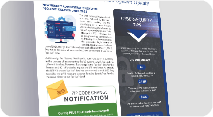 5 www.iambfo.org NEW BENEFIT ADMINISTRATION SYSTEM “GO-LIVE” DELAYED UNTIL 2022 The IAM National Pension Fund and IAM National 401(k) Fund have been working on the installation of a new Benefit Administration System known as V3 with a projected “go-live” date of August 1, 2021. However, due to programming complications on this very complex system and the anticipated high volume in pension applications in the latter part of 2021, the “go-live” date has been pushed back to March 1, 2022. Stay tuned for more V3 news and updates as we move closer to our “go-live” date! Additionally, the National IAM Benefit Trust Fund (BTF) is currently in the process of implementing the V3 system as well, but under a different timeline. However, the change in the “go-live” date for the Pension and 401k Funds also impacts the BTF installation. As a result, the BTF V3 system “go-live” date has been moved to mid-2022. Stay tuned for more V3 news and updates from the Benefit Trust Fund as we move closer to our “go-live” date! V3 Benefit Administration System Update ZIP CODE CHANGE NOTIFICATION Our zip PLUS FOUR code has changed! The U.S. Postal Service has notified the IAM National Benefit Funds Office that our zip PLUS FOUR code has changed from 20003-3799 to 20003-4595 effective August 1st, 2021. Moving forward, please send all mail to 99 M Street SE, Suite 600, Washington, DC 20003-4595. Please note that mail addressed to the old zip PLUS FOUR code should still be delivered to the Benefit Fund Office, but we encourage you to use the new code for quicker delivery. CYBERSECURITY TIPS When accessing your online retirement account(s), it is important to make sure you protect yourself from the risk of fraud. DID YOU KNOW?! Identity theft reports doubled in the year 2020 from 2019 There were 2.18 million reports of online fraud and scams in 2020 The median online fraud loss was $635 for victims aged 70 to 79 in 2020 Skiba, K. (2021, February 5). Pandemic Proves to Be Fertile Ground for Identity Thieves. AARP. https://www.aarp.org/money/scams-fraud/info- 2021/ftc-fraud-report-identity-theft-pandemic.html 2x 2.18M $635 Click HERE for online security tips from the Employee Benefits Security Administration’s 2021 Cybersecurity program for retirement plans!