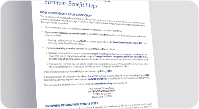 9 www.iambfo.org HOW TO DESIGNATE YOUR BENEFICIARY The designation of your beneficiary(ies) during the pension application process or as a pensioner is an important part in ensuring applicable benefit coverage in the event of your passing. When designating or changing your beneficiary(ies) it is important to remember: 9 Your beneficiary must be a person; you cannot designate your estate as a beneficiary. 9 If you are not receiving a pension benefit from the IAM National Pension Fund (the “Fund”) and want to update your beneficiary(ies): › You may update it online via your IPASS account or by completing the Beneficiary Designation Form (PDF) and returning to the Benefit Funds Office. 9 If you are receiving a pension benefit from the IAM National Pension Fund: › If you were married at the time you began receiving your benefit payment and want to change your beneficiary(ies), you may only do so by completing and returning the Change/Election of Designation Beneficiary Form (PDF) to the Benefit Funds Office. Your spouse must provide signature and have it notarized in order to make beneficiary change(s). › If you are not married, you can update your beneficiary(ies) online via your IPASS account or complete and return the Change/Election of Designation Beneficiary Form (PDF) to the Benefit Funds Office. A Beneficiary Designation Form (PDF) can be obtained by clicking HERE. A Change/Election of Designation Beneficiary Form (PDF) for those receiving a benefit can be obtained by clicking HERE. Alternatively, you may request a form by email, [email protected], or by calling the Benefit Funds Office at 800-424-9608. The form can be returned to the Fund by emailing [email protected], or by mailing to: IAM National Pension Fund Attn: PENSION DEPARTMENT 99 M ST SE STE 600 Washington, DC 20003 OVERVIEW OF SURVIVOR BENEFIT STEPS The IAM Benefit Funds Office understands that the passing of a loved one is a difficult time and stands ready to assist you. Contact Customer Service at 800-424-9608 to report the passing of a Fund participant, retiree, or a beneficiary receiving a benefit. Upon notification, we will take the following steps to determine the appropriate beneficiary(ies) and award applicable survivor benefits. PRE AND POST RETIREMENT SURVIVOR BENEFITS Pre-Retirement Benefit (For a participant was not receiving an IAMNPF pension benefit at the time of their passing) 9 If you are the spouse, the beneficiary and/or next of kin, contact the Benefit Funds Office to request a Pre-Retirement Death Benefit Application. Beneficiary Designation and Survivor Benefit Steps BENEFITS SPOTLIGHT | FALL 2021