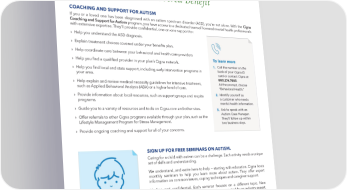 11 www.iambfo.org SIGN UP FOR FREE SEMINARS ON AUTISM. Caring for a child with autism can be a challenge. Each activity needs a unique set of skills and understanding. We understand, and we’re here to help — starting with education. Cigna hosts monthly seminars to help you learn more about autism. They offer expert information on common issues, coping techniques and caregiver support. It’s free and confidential. Each seminar focuses on a different topic. New seminars are featured every month and each is presented by an industry expert. COACHING AND SUPPORT FOR AUTISM If you or a loved one has been diagnosed with an autism spectrum disorder (ASD), you’re not alone. With the Cigna Coaching and Support for Autism program, you have access to a dedicated team of licensed mental health professionals with extensive expertise. They’ll provide confidential, one-on-one support to: › Help you understand the ASD diagnosis. › Explain treatment choices covered under your benefits plan. › Help coordinate care between your behavioral and health care providers › Help you find a qualified provider in your plan’s Cigna network. › Help you find local and state support, including early intervention programs in your area. › Help explain and review medical necessity guidelines for intensive treatment, such as Applied Behavioral Analysis (ABA) or a higher level of care. › Provide information about local resources, such as support groups and respite programs. › Guide you to a variety of resources and tools on Cigna.com and other sites. › Offer referrals to other Cigna programs available through your plan, such as the Lifestyle Management Program for Stress Management. › Provide ongoing coaching and support for all of your concerns. Autism is Now a Covered Benefit LEARN MORE TODAY. Sign up for our Autism Awareness series at Cigna.com/autism. * Centers for Disease Control and Prevention, Data & Statistics on Autism Spectrum Disorder, September 2020; https://www.cdc.gov/ncbddd/autism/data.html. Autism affects 1 in 54 children.*