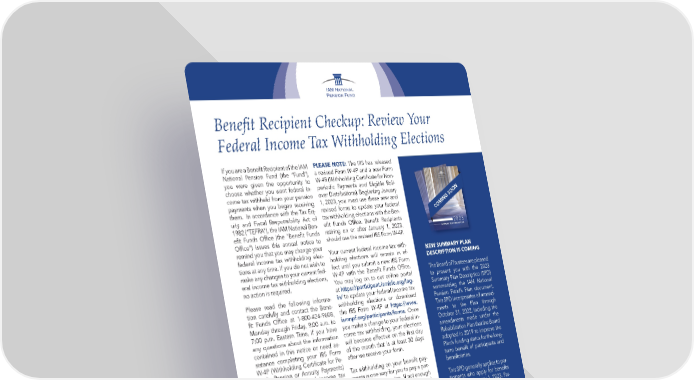 Benefit Recipient Checkup: Review Your Federal Income Tax Withholding Elections If you are a Benefit Recipient of the IAM PLEASE NOTE: The IRS has released National Pension Fund (the “Fund”), a revised Form W-4P and a new Form you were given the opportunity to W-4R (Withholding Certificate for Non- choose whether you want federal in- periodic Payments and Eligible Roll- come tax withheld from your pension over Distributions). Beginning January payments when you began receiving 1, 2023, you must use these new and them. In accordance with the Tax Eq- revised forms to update your federal uity and Fiscal Responsibility Act of tax withholding elections with the Ben- COMING SOON efit Funds Office. Benefit Recipients 1982 (“TEFRA”), the IAM National Ben- 2023 2023 retiring on or after January 1, 2023, Y PLAN DESCRIPTION efit Funds Office (the “Benefit Funds SUMMAR Office”) issues this annual notice to should use the revised IRS Form W-4P. SUMMARY PLAN DESCRIPTION remind you that you may change your Your current federal income tax with- federal income tax withholding elec- holding elections will remain in ef- NEW SUMMARY PLAN tions at any time. If you do not wish to fect until you submit a new IRS Form DESCRIPTION IS COMING make any changes to your current fed- W-4P with the Benefit Funds Office. The Board of Trustees are pleased eral income tax withholding elections, You may log on to our online portal to present you with the 2023 no action is required. at https://participant.iambfo.org/log- Summary Plan Description (SPD) Please read the following informa- in/ to update your federal income tax summarizing the IAM National tion carefully and contact the Bene- withholding elections or download Pension Fund’s Plan document. fit Funds Office at 1-800-424-9608, the IRS Form W-4P at https://www. This SPD incorporates all amend- Monday through Friday, 9:00 a.m. to iamnpf.org/participants/forms. Once ments to the Plan through 7:00 p.m. Eastern Time, if you have you make a change to your federal in- October 31, 2022, including the any questions about the information come tax withholding, your elections amendments made under the contained in this notice or need as- will become effective on the first day Rehabilitation Plan that the Board sistance completing your IRS Form of the month that is at least 30 days adopted in 2019 to improve the W-4P (Withholding Certificate for Pe- after we receive your form. Plan’s funding status for the long- riodic Pension or Annuity Payments) Tax withholding on your benefit pay- term benefit of participants and to update your federal income tax ments is one way for you to pay a por- beneficiaries. withholding elections. It is important tion of your income tax. If not enough This SPD generally applies to par- to note the amount of the 2023 fed- tax is being withheld from your total ticipants who apply for benefits eral income tax being withheld from taxable income for the year, you may on or after January 1, 2023. Par- your payments may change because have to pay estimated taxes during ticipants who apply for benefits the withholding tables have changed. the year or a tax penalty at the end before that date should refer to of the year. Of course, whether or not the 2017 SPD (and any summa- you have to pay federal income tax ries of material modification to depends on the total amount of your the 2017 SPD). taxable income, not just on your ben- efit payments from the Fund. Remem- We hope this summary will be of ber, for many people, Social Security assistance to you and your family benefits are not taxable. in understanding the Plan. Your decision on withholding is an We believe that this SPD accu- important one. If you need addition- rately reflects the Fund. Please re- al assistance estimating your tax, you member, though, that the text of should consult with a tax advisor or the Plan itself, as interpreted by the IRS. The Benefit Funds Office is the Board of Trustees, represents unable to assist you with computing the final authority in all cases. your estimated federal income tax. 5