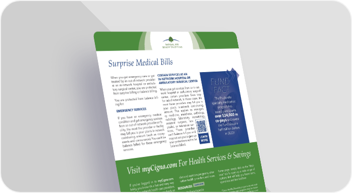 Surprise Medical Bills When you get emergency care or get CERTAIN SERVICES AT AN treated by an out-of-network provider IN-NETWORK HOSPITAL OR at an in-network hospital or ambula- AMBULATORY SURGICAL CENTER tory surgical center, you are protected FUND from surprise billing or balance billing. When you get services from an in-net- FUND work hospital or ambulatory surgical FACT You are protected from balance bill- center, certain providers there may FACT ing for: be out-of-network. In these cases, the The PrudentRx EMERGENCY SERVICES most those providers may bill you is specialty medication your plan’s in-network cost-sharing program has If you have an emergency medical amount. This applies to emergen- condition and get emergency services cy medicine, anesthesia, pathology, saved participants from an out-of-network provider or fa- radiology, laboratory, neonatology, over $24,000 in cility, the most the provider or facility assistant surgeon, hos- co-pays and saved may bill you is your plan’s in-network pitalist, or intensivist ser- the Fund about a costsharing amount (such as copay- vices. These providers ments and coinsurance). You can’t be can’t balance bill you and half million dollars balance billed for these emergency may not ask you to give up LEARN in 2022! services. your protections not to be MORE balance billed. Visit myCigna.com For Health Services & Savings If you’ve logged in to myCigna.com diet and nutrition programs, alter- home page, simply click on the “Well- lately, you know it’s a fast and easy way native health providers and more. ness” tab to open up a wide range of to find in-network health care providers, RESOURCES LEARN MORE options that will help you know more, learn about your coverage or check on spend less and live healthier. claims. But did you know that myCigna. • Health Encyclopedia com and the myCigna® App can also • Health Topics and Resources * Some Healthy Rewards programs are not avail- connect you with support tools and • Health Information Line (HIL) able in all states and programs may be discon- services that can help you get healthi- tinued at any time. If your plan includes cover- er and save money? And, what’s more, • WebMD Health Manager age for any of these services, this program is in they’re available whenever you need addition to, not instead of, your plan coverage. them and at no additional cost to you. And finally, keep in mind myCigna is al- A discount program is NOT insurance, and you Here are just a few. ways there for finding local in-network must pay the entire discounted charge. TOOLS LEARN MORE care, provider quality information, and estimates for what your health care will • My Health Assessment cost you. They can be easily searched HOW HEALTHY ARE YOU? • Apps & Activities under “My Care and Costs” on the Complete an easy online • Personal Health Record myCigna home page. health assessment and earn • My Health Assistant To learn more about the many a $50 gift card from Cigna. myCigna programs and resources avail- REWARDS AND PROGRAMS able to you, ask your Cigna coach, or GET STARTED • Healthy Rewards® Program:* visit myCigna.com or the myCigna App Find discounts for fitness centers, to check them out. On the top of the 6