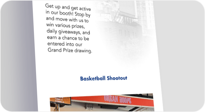 Play with us. Get up and get active in our booth! Stop by and move with us to win various prizes, daily giveaways, and earn a chance to be entered into our Grand Prize drawing. Basketball Shootout Massages