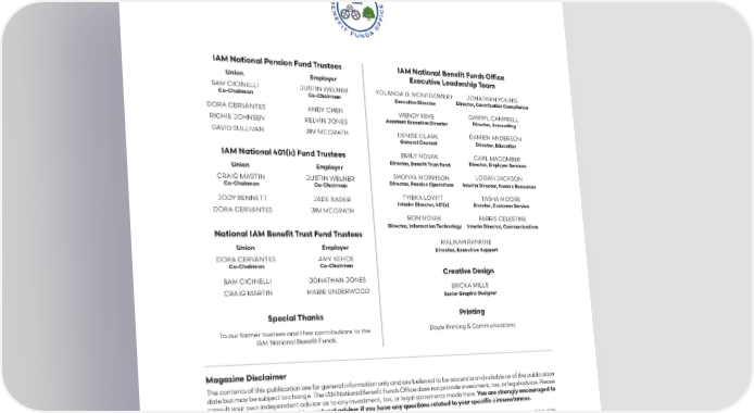 IAM National Pension Fund Trustees IAM National Bene昀椀t Funds Of昀椀ce Union Employer Executive Leadership Team SAM CICINELLI JUSTIN WELNER YOLANDA D. MONTGOMERY JONATHAN YOUNG Co-Chairman Co-Chairman Executive Director Director, Contribution Compliance DORA CERVANTES ANDY CHEN WENDY FRYE DARRYL CAMPBELL RICHIE JOHNSEN KELVIN JONES Assistant Executive Director Director, Accounting DAVID SULLIVAN JIM MCGRATH DENISE CLARK DAMIEN ANDERSON General Counsel Director, Education IAM National 401(k) Fund Trustees EMILY NOVAK CARL MACOMBER Director, Bene昀椀t Trust Fund Director, Employer Services Union Employer CRAIG MARTIN JUSTIN WELNER SHONYA MORRISON LOGAN JACKSON Co-Chairman Co-Chairman Director, Pension Operations Interim Director, Human Resources JODY BENNETT JADE BADER TYIEKA LOVITT TASHA MOORE Interim Director, 401(k) Director, Customer Service DORA CERVANTES JIM MCGRATH RON NOVAK PARRIS CELESTINE Director, Information Technology Interim Director, Communications National IAM Bene昀椀t Trust Fund Trustees Union Employer MALIKAH RANKINE Director, Executive Support DORA CERVANTES AMY KEHOE Co-Chairman Co-Chairman Creative Design SAM CICINELLI JONATHAN JONES CRAIG MARTIN MARIE UNDERWOOD ERICKA MILLS Senior Graphic Designer Special Thanks Printing To our former trustees and their contributions to the Doyle Printing & Communications IAM National Bene昀椀t Funds. Magazine Disclaimer The contents of this publication are for general information only and are believed to be accurate and reliable as of the publication date but may be subject to change. The IAM National Bene昀椀t Funds Of昀椀ce does not provide investment, tax, or legal advice. Please consult your own independent advisor as to any investment, tax, or legal statements made here. You are strongly encouraged to consult with your independent tax or legal adviser if you have any questions related to your speci昀椀c circumstances. NOTE: This page has been revised as of July 2024. 02 JOURNEY TO RETIREMENT OCTOBER 2022