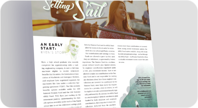 Se琀琀ing Se琀琀ing SailSail AN EARLY Both the Pension Fund and the 401(k) Fund choose where those contributions are invested allow for money to be set aside for retire- from among several investment options the START: ment on a tax-advantaged basis, meaning 401(k) Fund makes available. Along with Social RYEN’S STORY that contributions and earnings to these Security and personal savings — such as through Funds are allowed to grow tax-free until the 401(k) Fund — the Pension Fund offers Ryen they are withdrawn, as governed by federal a valuable retirement income source for years Ryen, a high school graduate who recently regulations. The Pension Fund is a multiem- to come. completed his apprenticeship with a lead- ployer de昀椀ned bene昀椀t plan funded entirely ing engineering company, is now a full-time by employer contributions negotiated under machinist eligible to receive retirement a CBA, plus investment income. Ryen is not bene昀椀ts that his union, the International Asso- allowed to make any contributions to the Pen- ciation of Machinists and Aerospace Workers, sion Fund and is not responsible for making and employer have negotiated especially for any decisions about how those employer con- 62% of Americans machinists like him under a collective bar- tributions are invested. As a participant in the age 18-29 have some retirement savings, but gaining agreement (“CBA”). The CBA includes Pension Fund, once Ryen meets the require- only 28% feel on track bene昀椀ts options available under the IAM ments for a pension, when he retires, he will for retirement. https://www.federalreserve.gov/ National Pension Fund and the IAM National be eligible to receive a retirement bene昀椀t, typi- 401(k) Fund. With Ryen just starting on his cally paid monthly. By contrast, the 401(k) Fund 70% of Millennials are retirement journey, understanding the ben- is a multiemployer de昀椀ned contribution plan stressed and anxious about saving for e昀椀t options available under each of the Funds funded by both employer and employee retirement. allows him to set his retirement savings goals contributions. Ryen may elect to have con- https://www.annuity.org/ early and watch them grow over the course of tributions deducted from his paycheck his career. on a pre-tax and after-tax basis, as well as 03